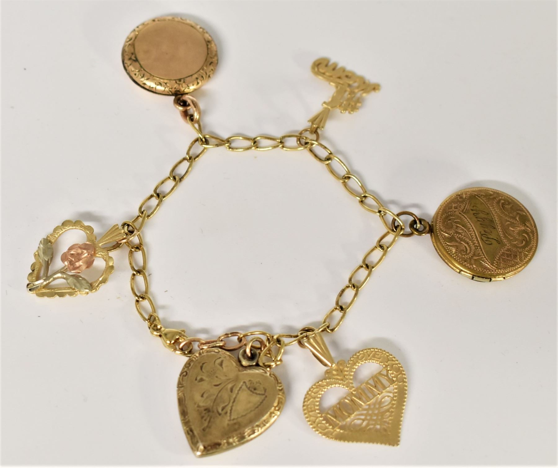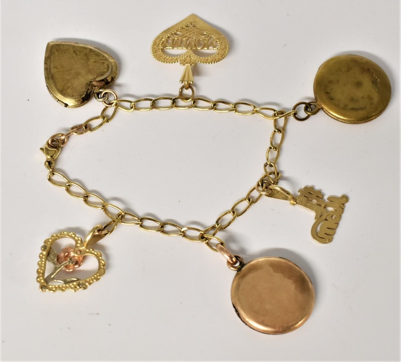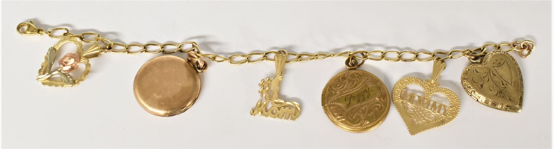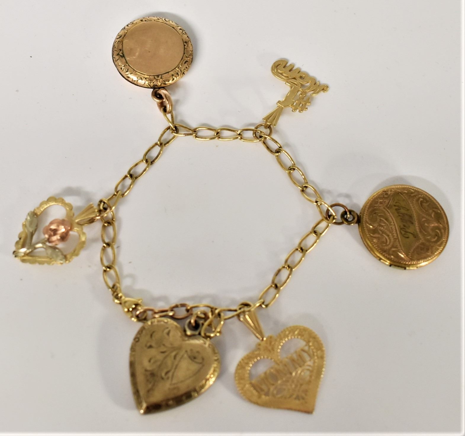 Estate Gold Plate Charm Bracelet, Some 14K Charms, bracelet measures 7''L end to end and is marked .925, includes 1. Antique/Vintage Heart Locket 2. Mommy Charm (marked 14K) 3. Antique/Vintage Gold Plate Sterling Locket (monogrammed Peggy, stamped 9STLIN 4. #1 Mom (marked 14K) 5. Antique H 1/4 G Gold Locket 6. Black Hills Gold Heart Charm