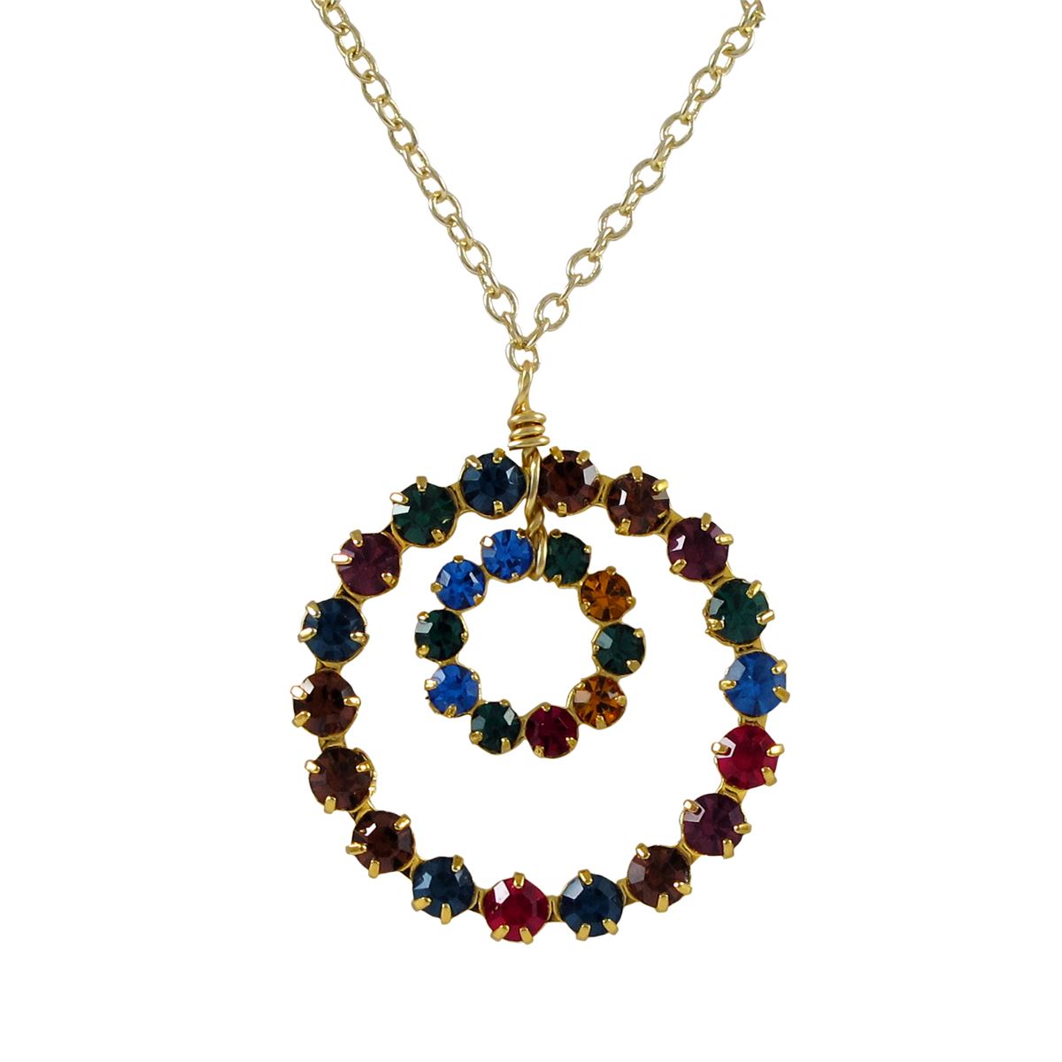 Gold Plated Brass, 11Mm Open Round Circle In 19.5Mm Round Open Circle With Dark Multi Color Crystals, Necklace, 16 2