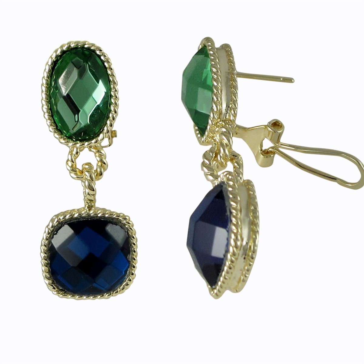 Gold Plated Brass Omega Clip Earrings In Green & Blue Color.