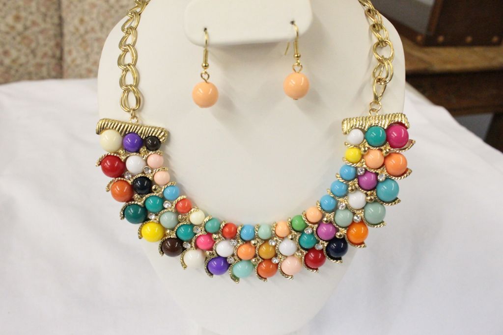Gold Plated Designer Necklace and Earrings With Multi Colored Resin Stones and C.Z.