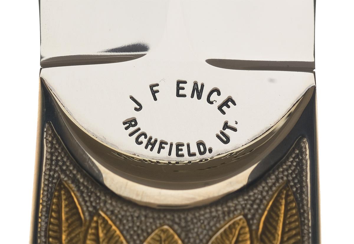 This boot knife was fabricated by master knifemaker Jim Ence. Jim Ence has handcrafted knives that have been compared to the craftsmanship of his long time friend and neighbor legendary knifemaker Buster Warenski. For years Ence and Warenski scouted the hills of Utah looking for minerals and gemstones and each influenced the other in his knifemaking. This Ence knife features a 5 1/4 inch double edged blade marked "J F ENCE / RICHFIELD, UT.". The left side of the bolster has a gold plated relief leaf engraving on a punch dot background. Fitted with ivory scales secured to the tang with four pins. The knife is complete with a metal sheath adorned with a tear drop accent exhibiting the same gold plated leaf engraving that is on the bolster. OAL: 9 1/2"