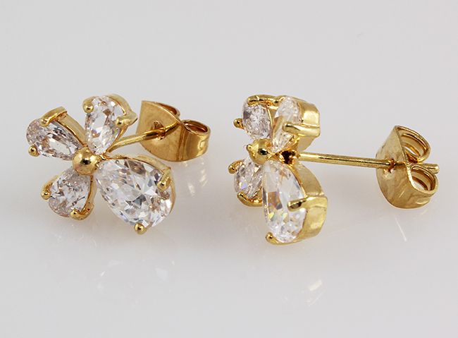 Gold Plated Fourl Leaf Flower Stud Earring **|**|** Fashion Jewelry Four Leaf Flower Design Gold Plated Stud Earring with Diamond Swarovski Crystal ; MSRP: $100