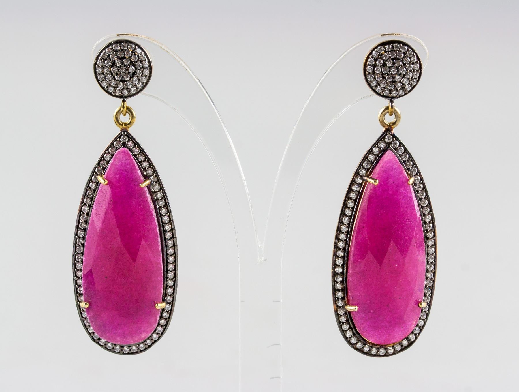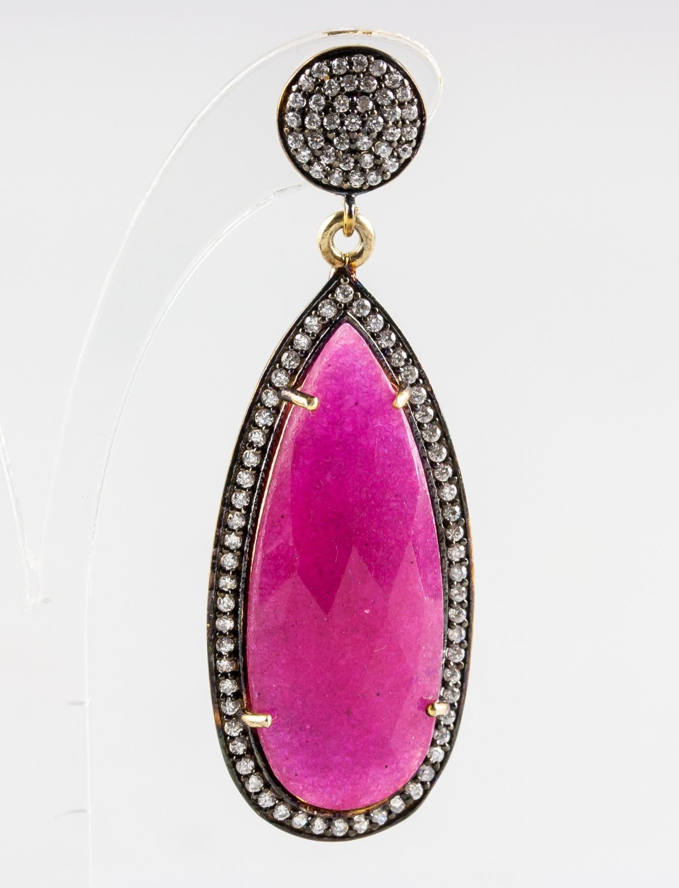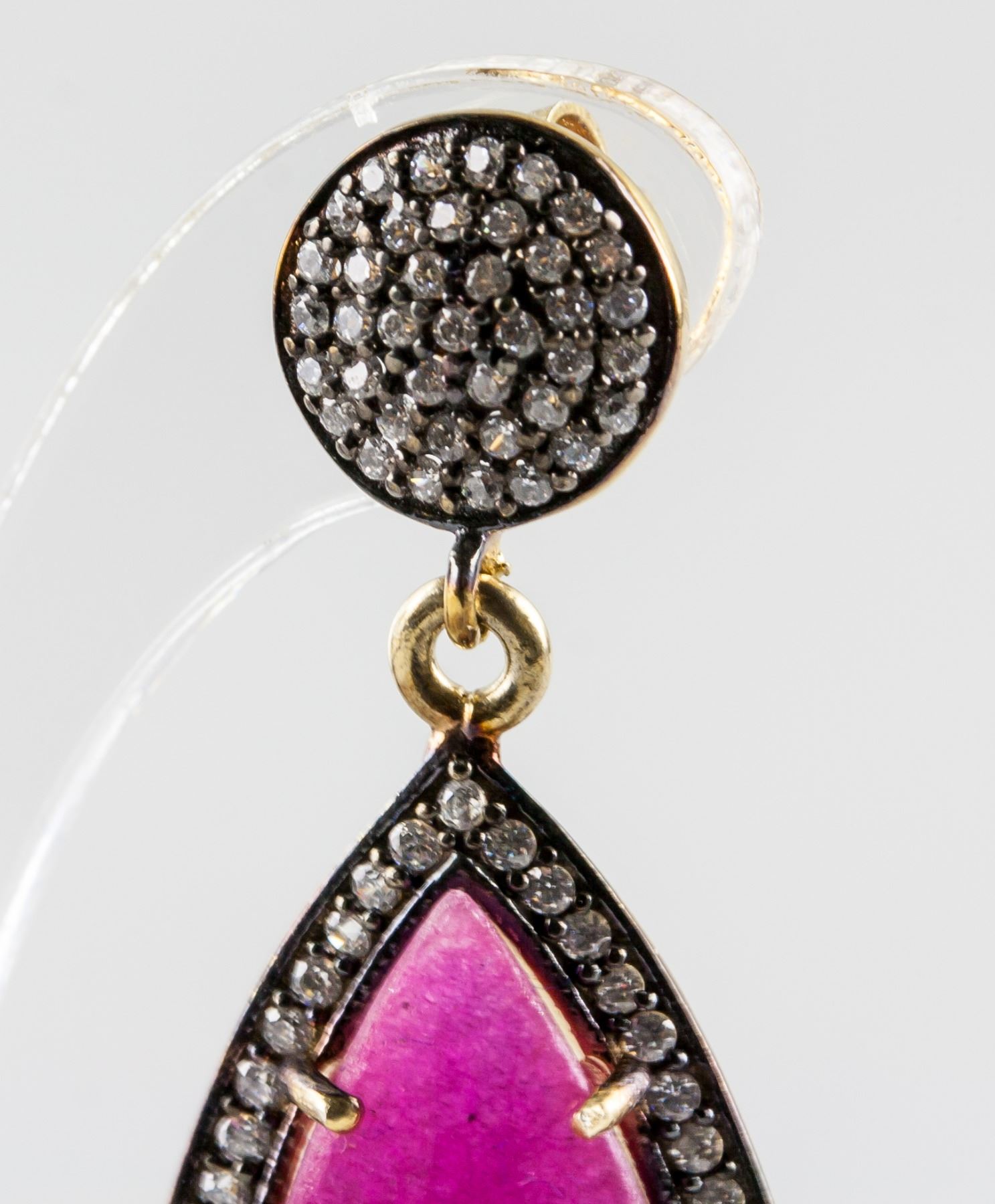 Stamped 925 silver and gold plated earrings, set with natural enhanced ruby and cubic crystals. Certified replacement value $833. 14 grams approximately.
