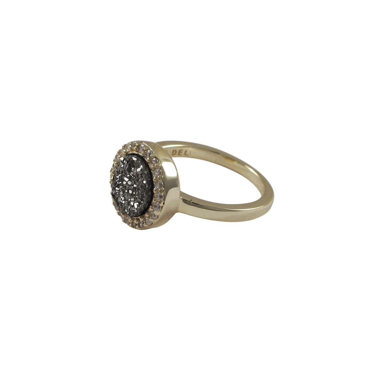 Gold Plated Sterling Silver, 11Mm Round Circe, 8Mm Grey Druzy Natural Stone With CZ Border, Ring Size 5