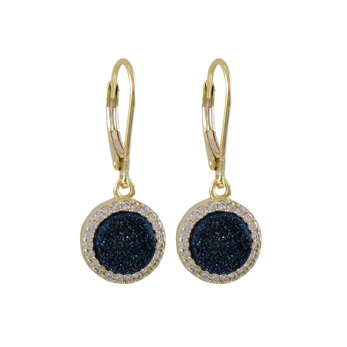 Gold Plated Sterling Silver, 11Mm Round Circle, Blue 8Mm Druzy Natural Stone With CZ Border, Lever Back Earrings, 1.10"