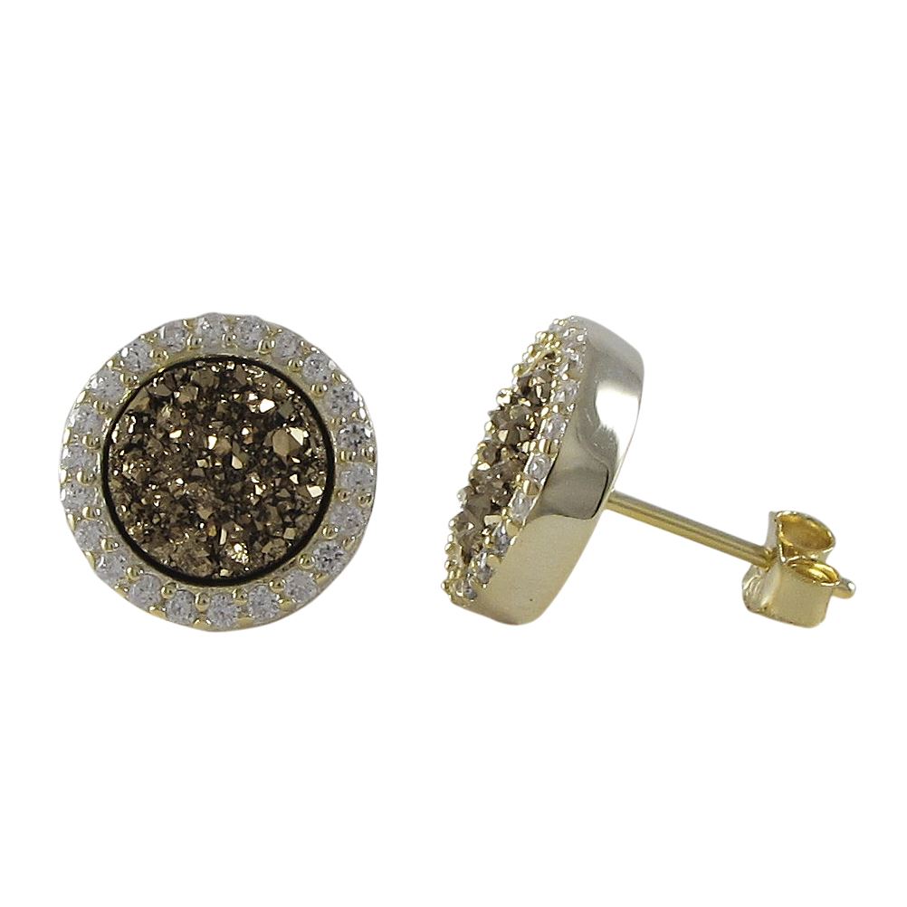 Gold Plated Sterling Silver, 11Mm Round Circle, Champagne 8Mm Druzy Natural Stone With CZ Border, Post Stud Earrings