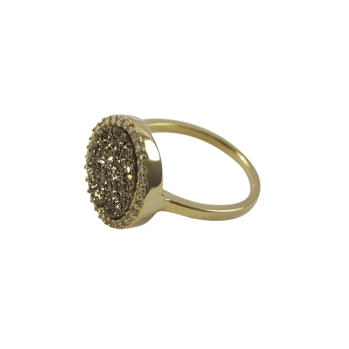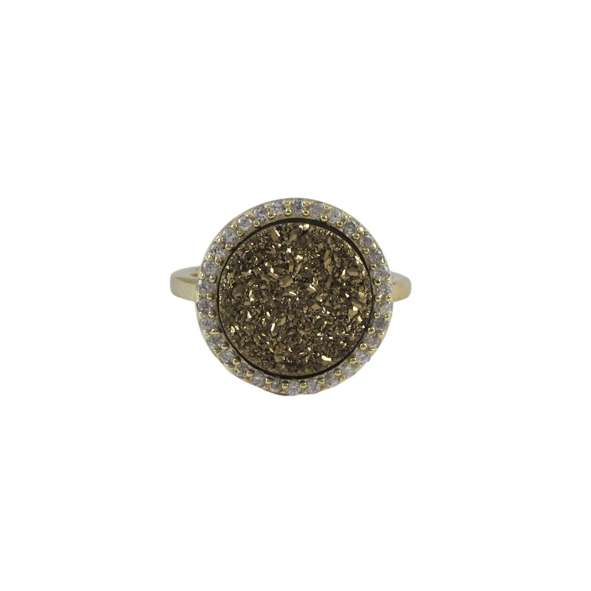 Gold Plated Sterling Silver, 15Mm Round Circle, 12Mm Champagne Druzy Natural Stone With CZ Border, Ring Size 8