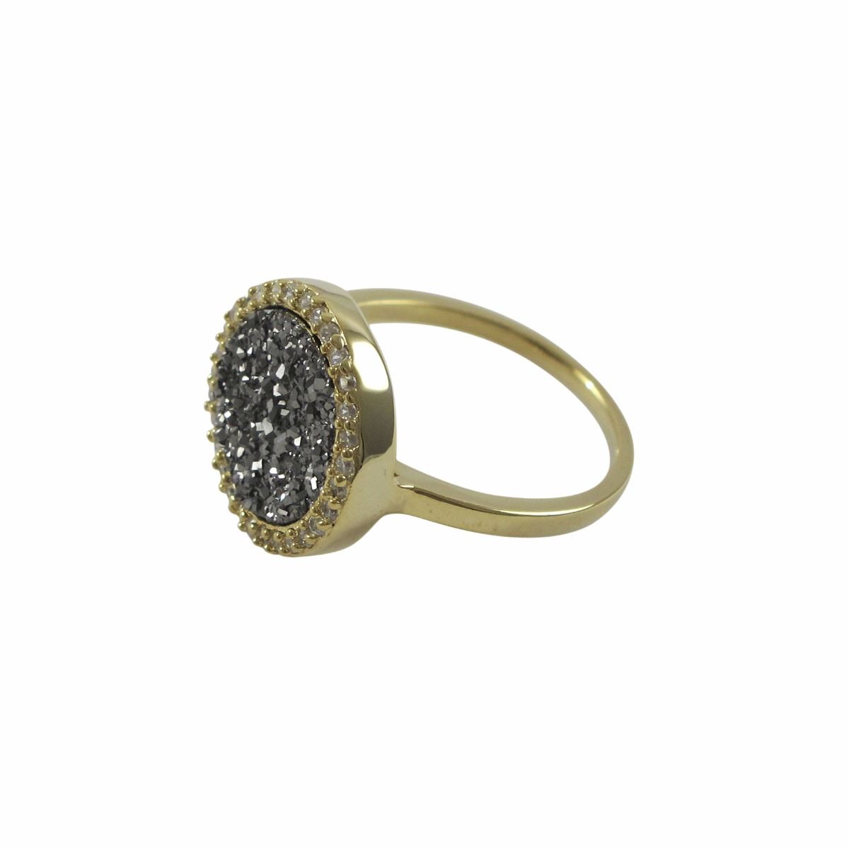 Gold Plated Sterling Silver, 15Mm Round Circle, 12Mm Grey Druzy Natural Stone With CZ Border, Ring Size 7