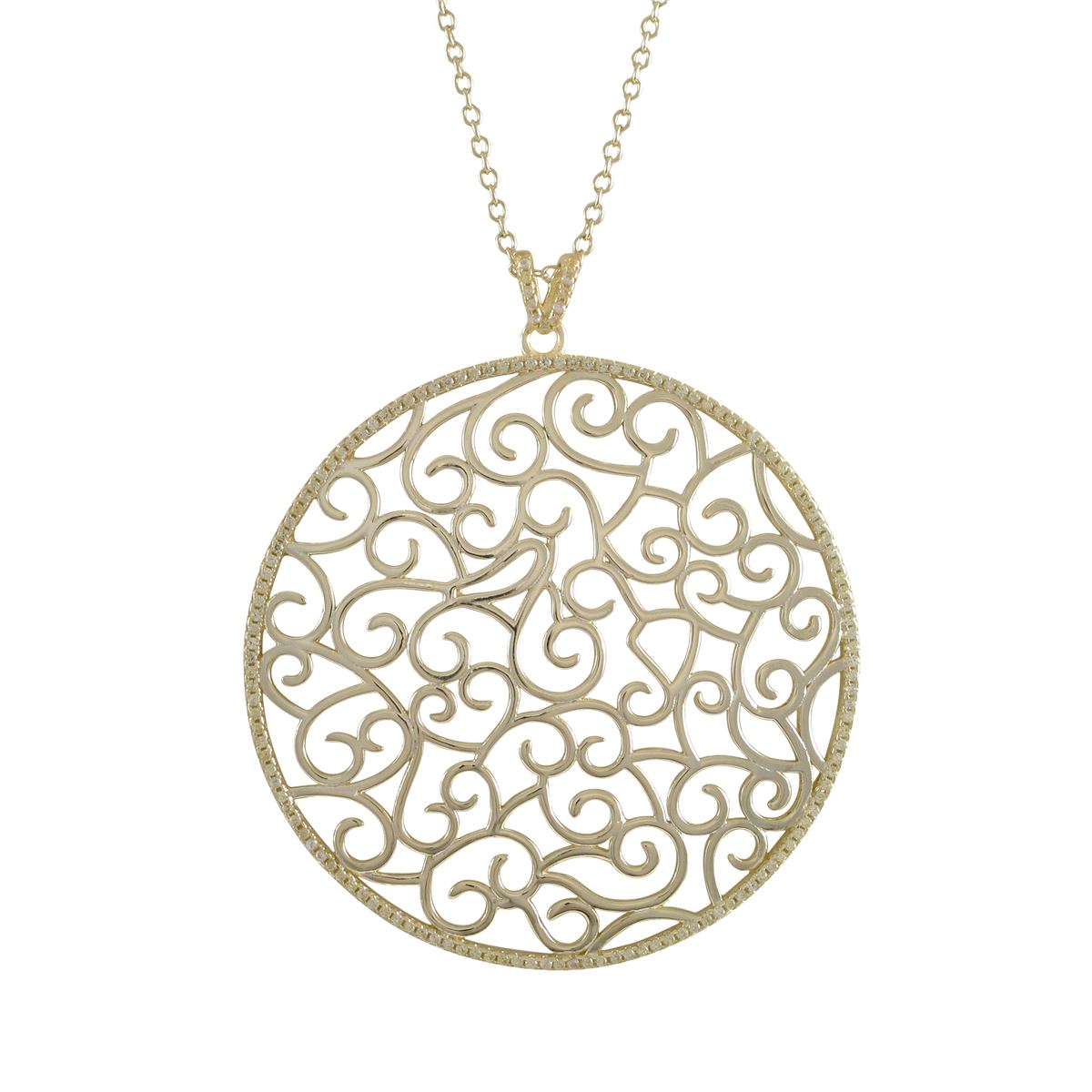 Gold Plated Sterling Silver, 51Mm Round Filigree Circle Pendant With Light Yellow CZ Border, 2.36
