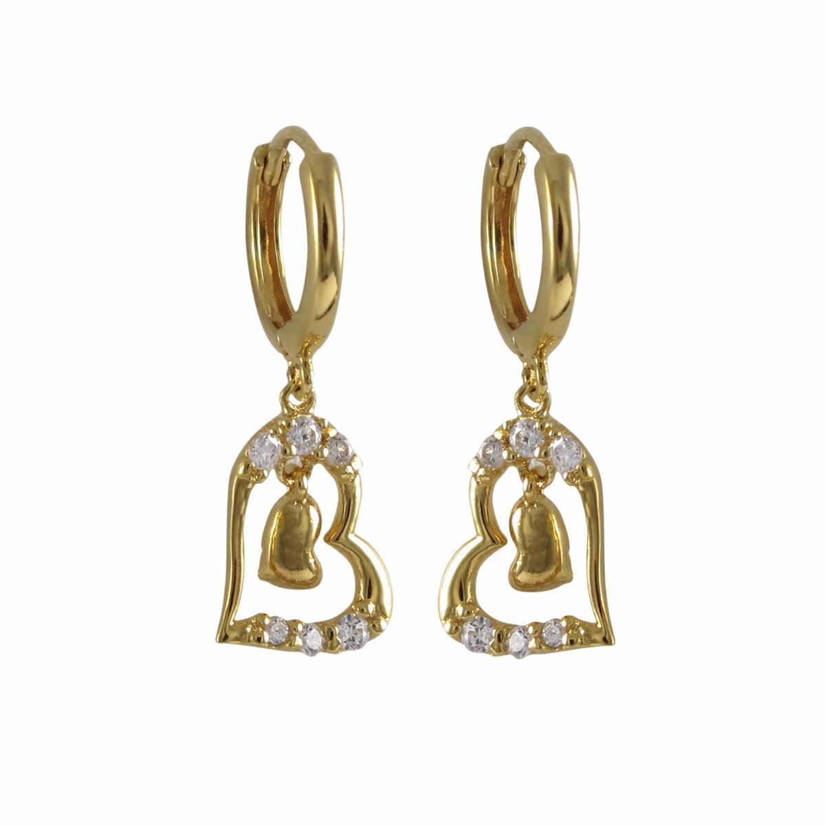 Gold Plated Sterling Silver, 9X11mm Open Heart With AAA CZ And Dangling Heart, Huggie Earrings, 0.94
