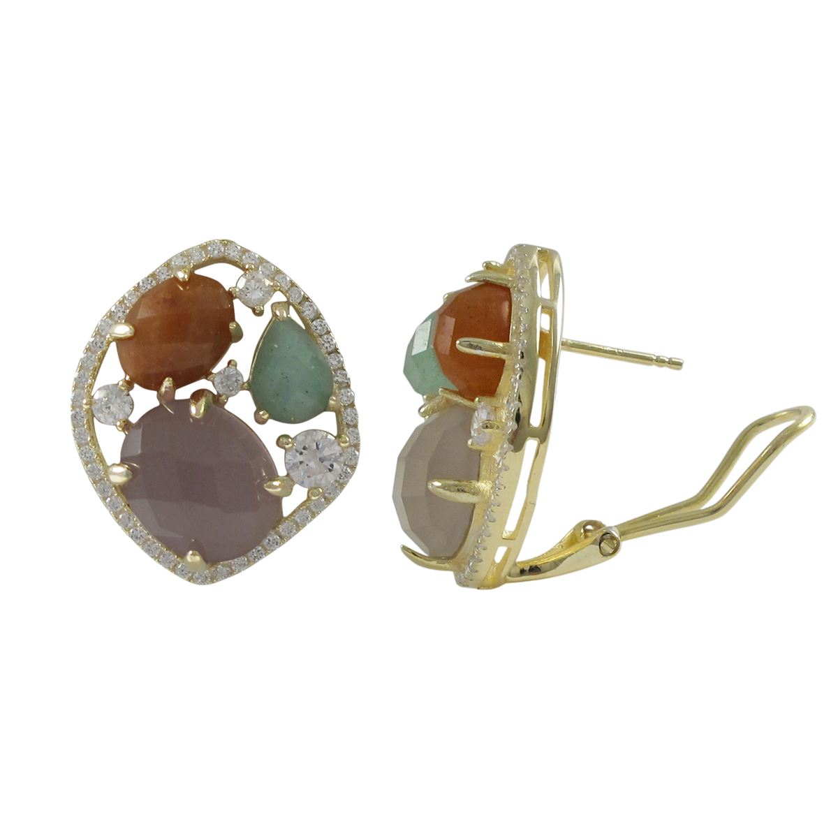 Gold Plated Sterling Silver CZ Post Clip Stud Earrings With Multi Color Combination Semi Precious Stones, 0.94"