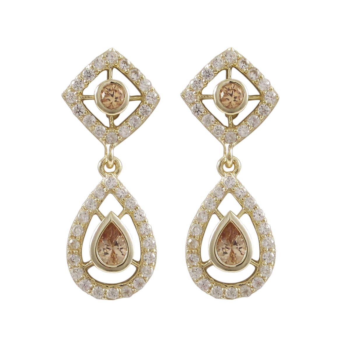 Gold Plated Sterling Silver CZ Post Earrings With Champagne Teardrop And Round CZ, 0.98"
