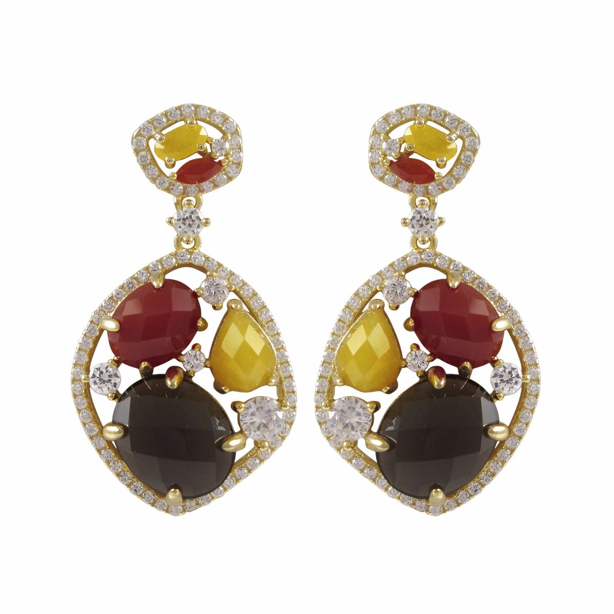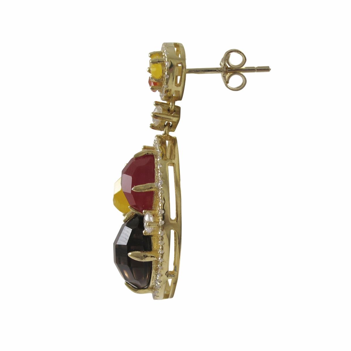 Gold Plated Sterling Silver CZ Post Earrings With Smoky Combination Semi Precious Stones, 1.42"