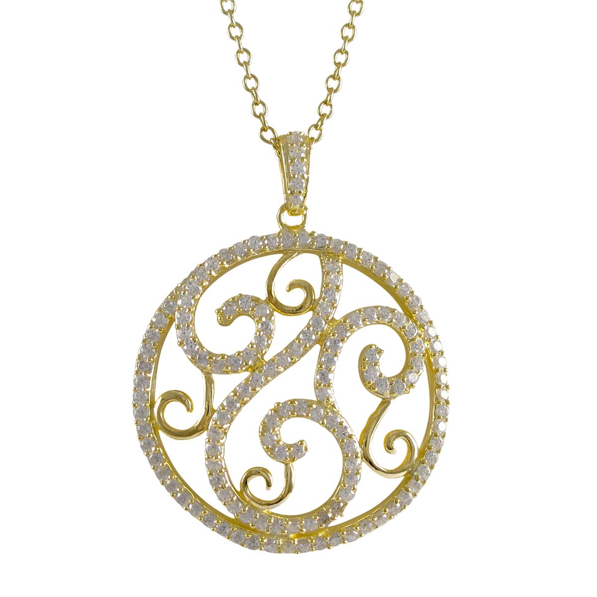 Gold Plated Sterling Silver Pendant, Swirl Design With White Czs, 42Mm Long, Circle Is 32Mm Wide