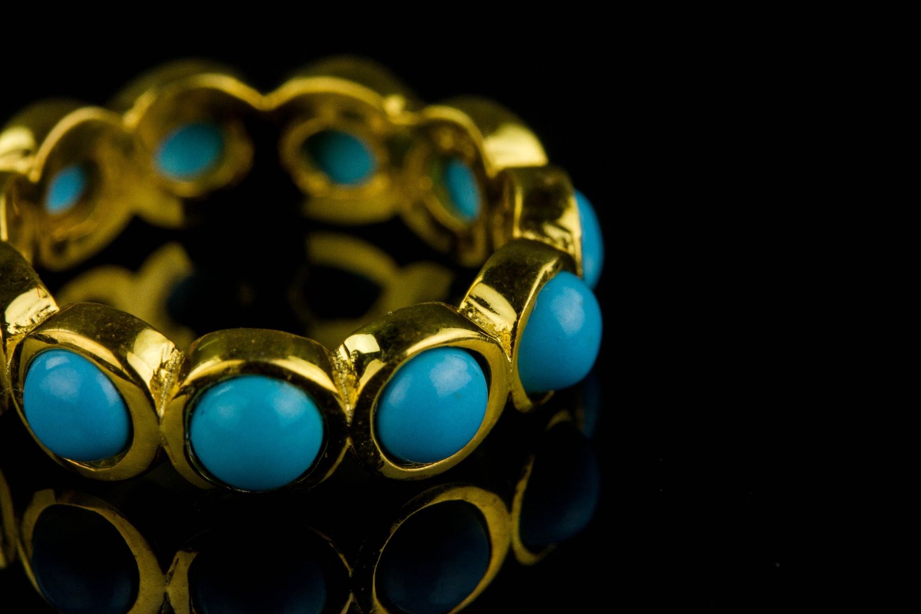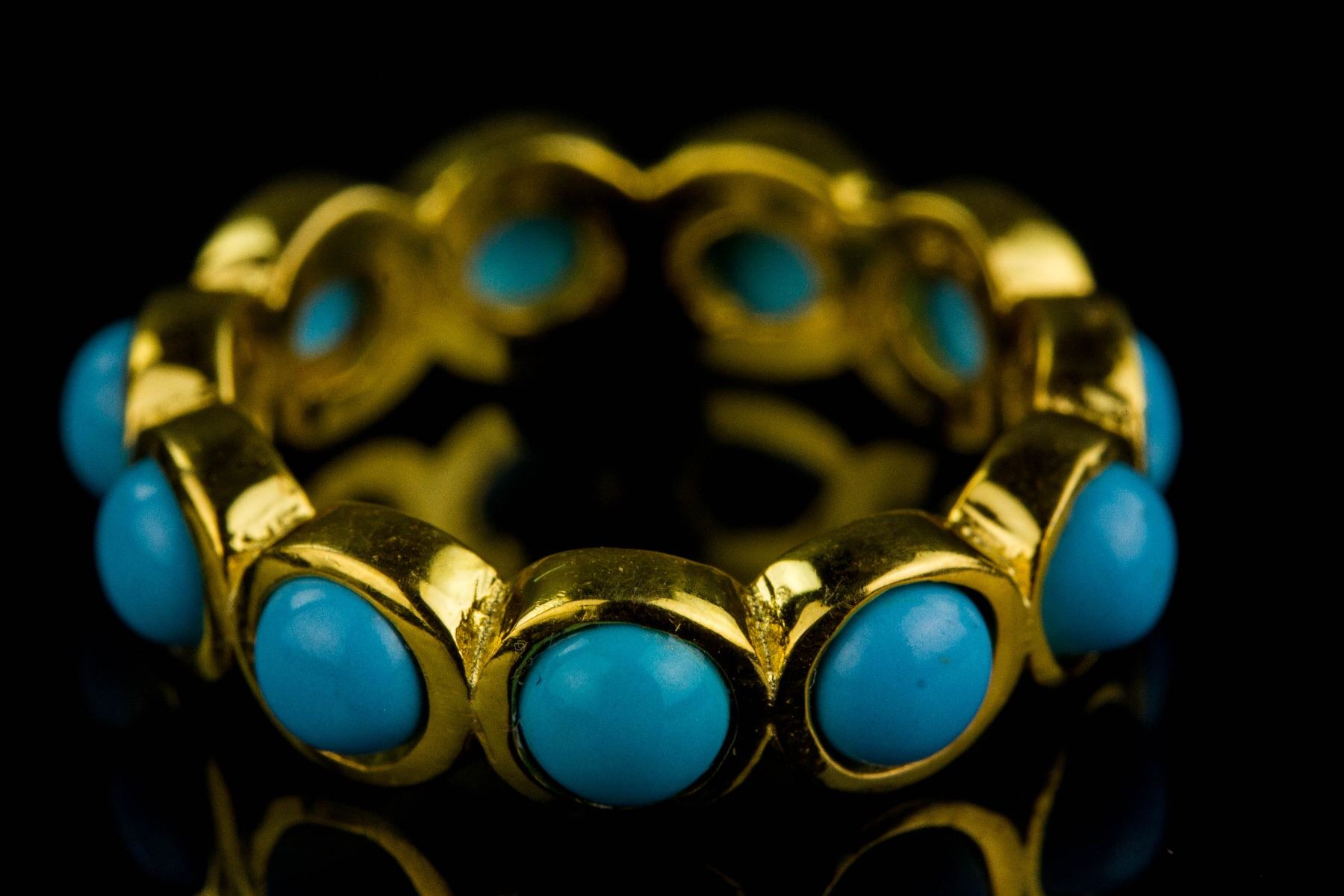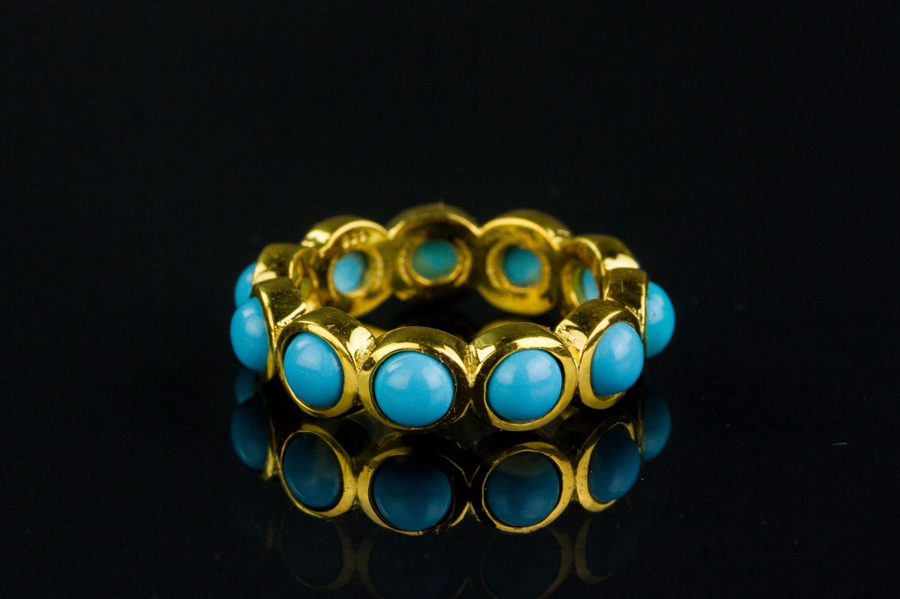 Gold plated sterling silver reconstituted turquoise ring; set with 11 semi-sphere turquoise beads; retail value $250; D: 1.6 cm, 4 grams