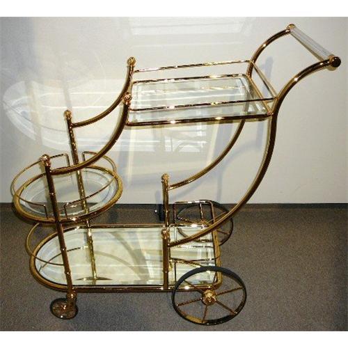 This is an exquisite gold plated three tier teacart trolly with a mirrored bottom shelf and two clear glass upper shelves. It is an oppulent, graceful and very useful furniture accessory that makes an elegant "Uber Luxe" statement in any interior setting...truly beautiful!!!