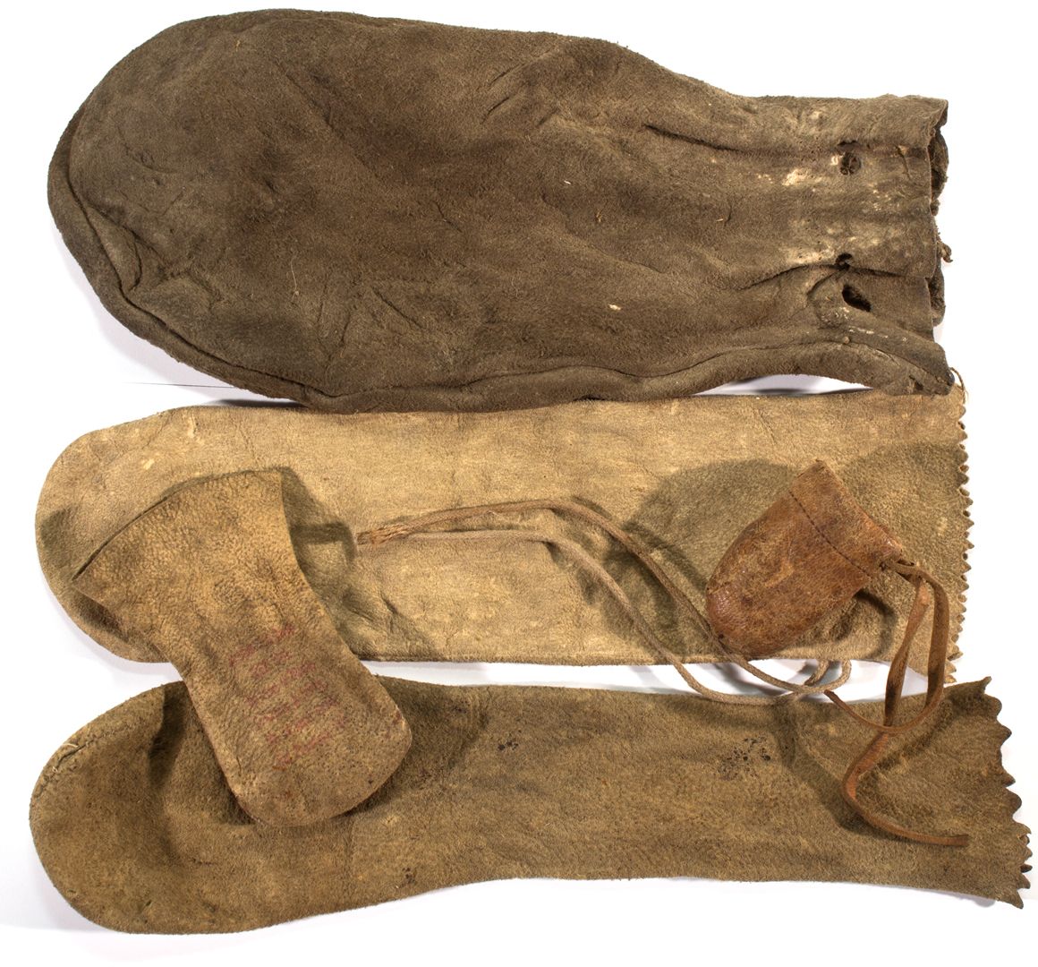 This is a unique group of five poke bags in various sizes. Three appear to be made from deerskin, while two are out of a heavier gauge skin, perhaps elk, buffalo or moose. The bags measure as follows; 8"x 3", 8.5"x 2.25", 9"x 2", 3"x 1.5" and 1.5"x 1". Two still have their tie thongs attached and all seem in very good condition. No indication if they are from California, Alaska or some other gold region. Unfortunately they are all empty.