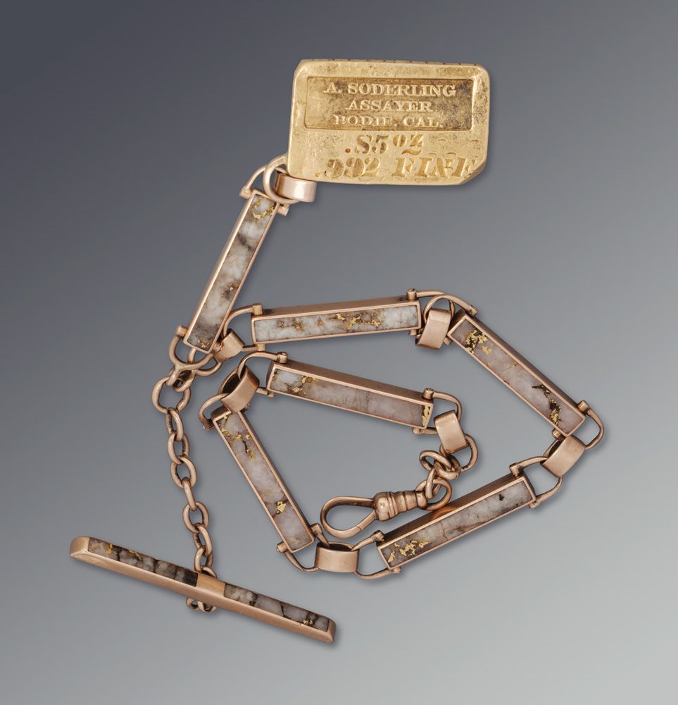 Gold Quartz "Bodie" Watch Chain and Fob. Button bar and 6 links of gold-wrapped heavily marbled quartz, with gold fob. The souvenir fob is marked "A. Soderling / Assayer / Bodie, Cal. / .85 oz / .992 Fine" on one side, around the edge is stamped "Recovered by Cyanide 1895". Overall weight of the entire piece is approximately 2 oz. Fob measures 3/4" x 1 1/4", overall 13 1/4" in length.