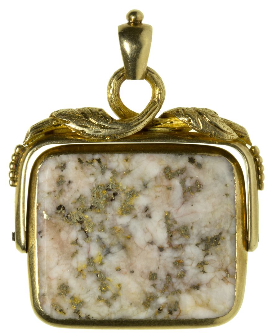Gorgeous gold quartz purse shaped pendant .89 troy ounce total weight. Unusual pinkish tones in the background of the stone along with the traditional white quartz. A thing of beauty. HKA#62626