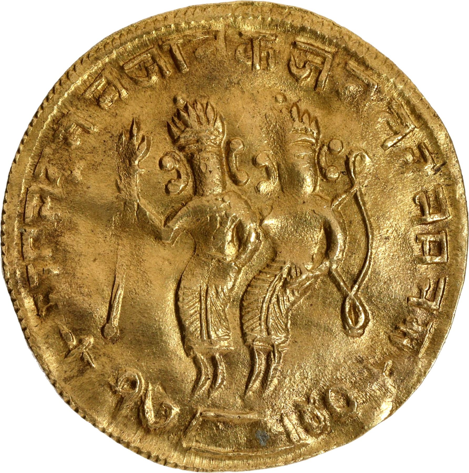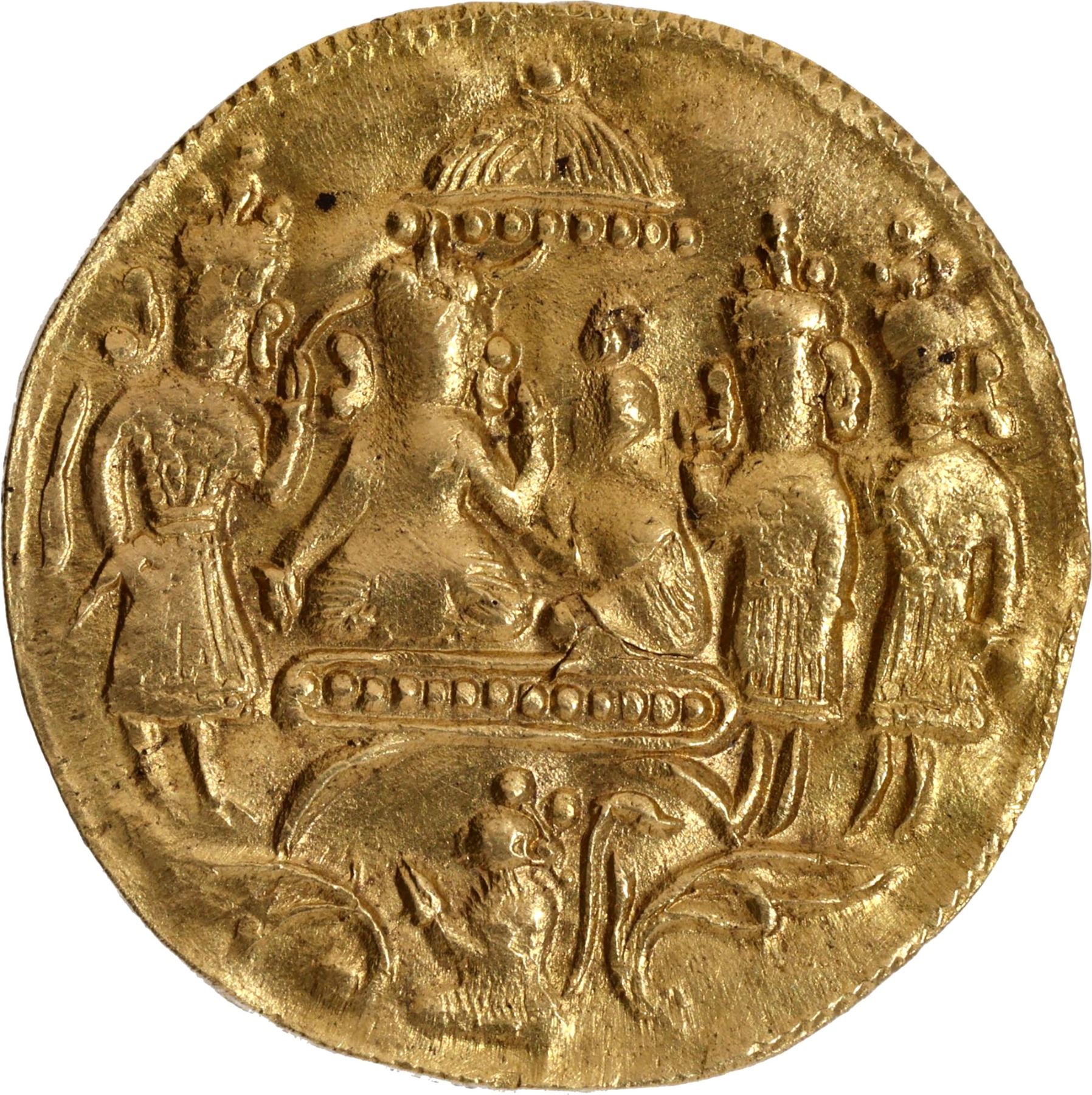 Ram Darbar Token (Mid 19 Century CE), Gold Ramtanka, Obv: Durbar scene, Rama and Sita seated on durbar platform, attendant standing on the left holds parasol above them, Kusha and Lava, the two sons of Rama Sita standing on the right, Hanuman sit beneath the platform, Rev: Rama standing on left holding and Lakshmana standing on the right, both holding a trident and bow, Nagari legend and date around, 5.7g, 26.60mm, about extremely fine, Rare.