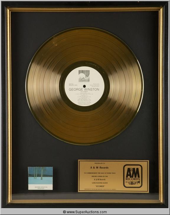 Framed Gold Record Disk Award T A&M SP04841B-TI / George Winston "December" / Presented to A&M Records To Commemorate The Sale Of More Than 500,000 Copies { 17" L x 1 1/2" W x 21" H} {3 Pounds}