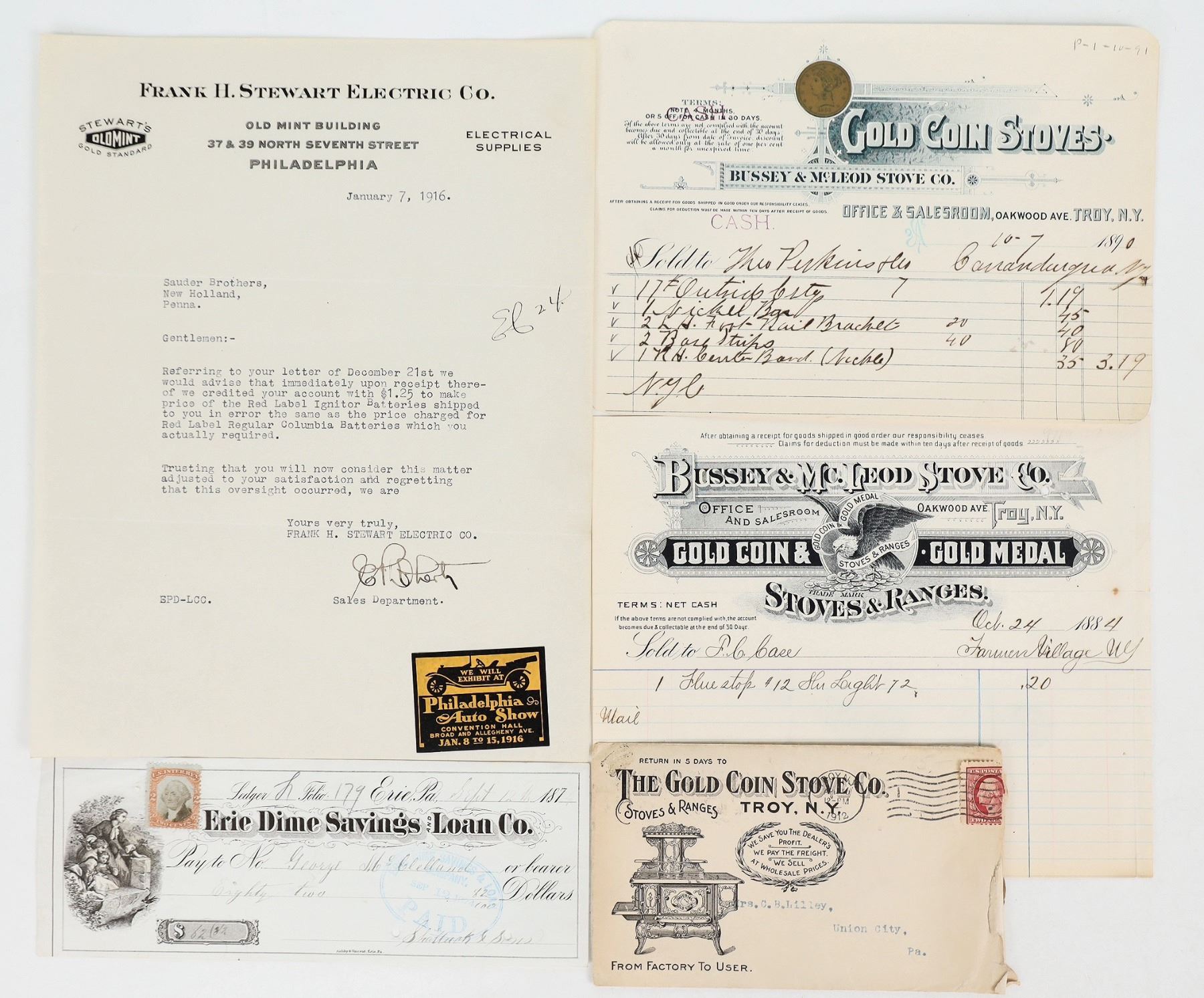 Lot of 5. 1.Two receipts: , 10-7-1890 &94. Bussey & McLeod Stove CO., Gold Coin Stoves, N.Y. 2. Erie Dime Savings and Loan Co. bank draft Sept 1874, 2 cent revenue stamp. 3. Shipping receipt and envelope from The Gold Coin Stove Co. for D& H railroad and instructions to customer. 4. Letter from Stewart Electric Co Philadelphia, Jan 7, 1916 re: refund.