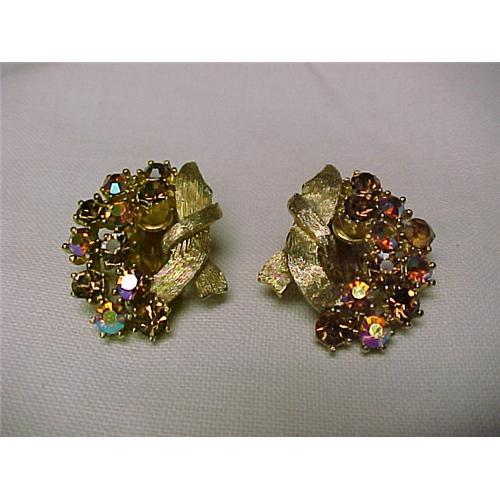 This pair of gold rhinestone and aurora borealis earrings with brushed gold tone trim are outstanding. The unusual color makes them so unique. These earrings are clip-ons. There may have been some repair as seen in image 4 to one stone, otherwise beautiful!