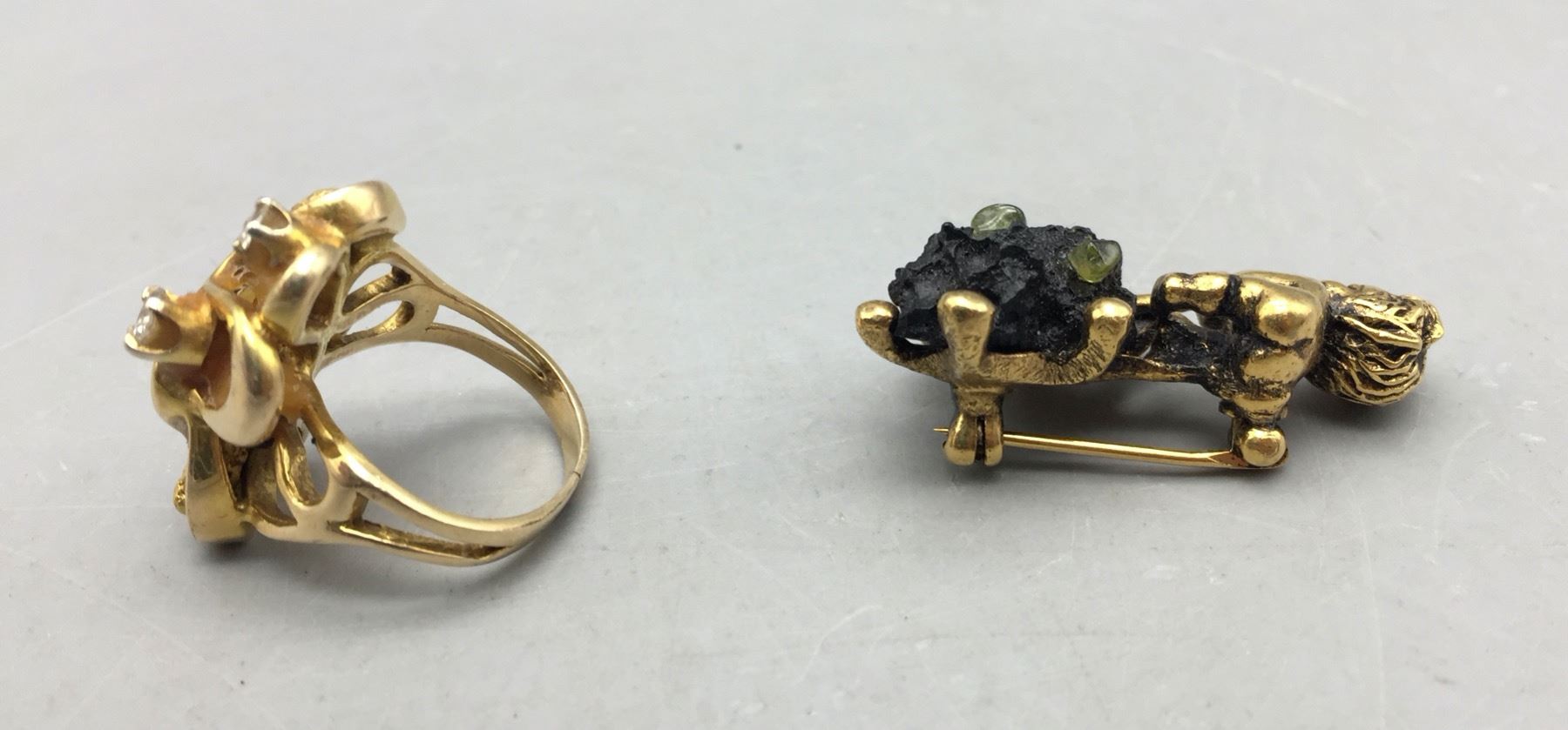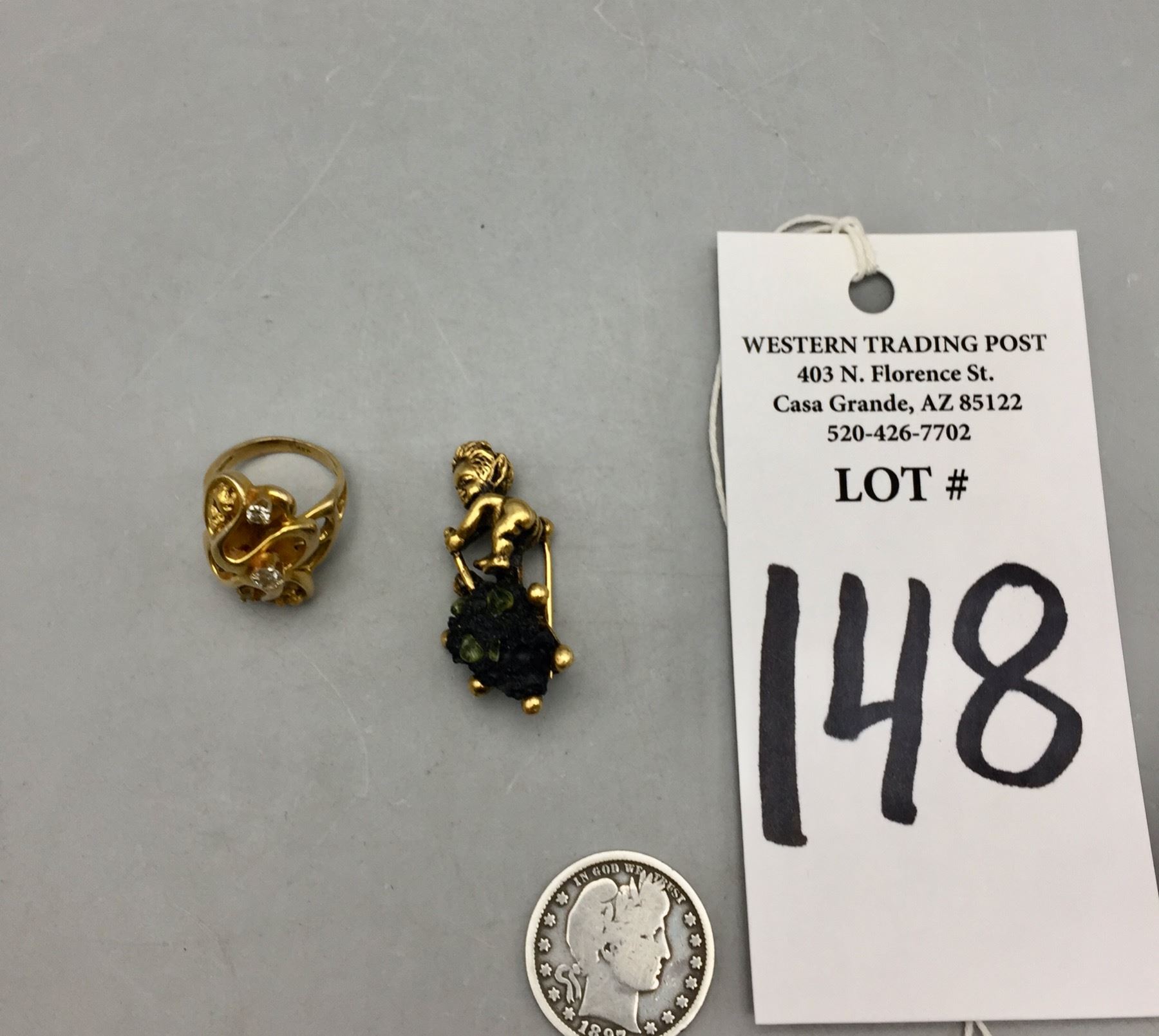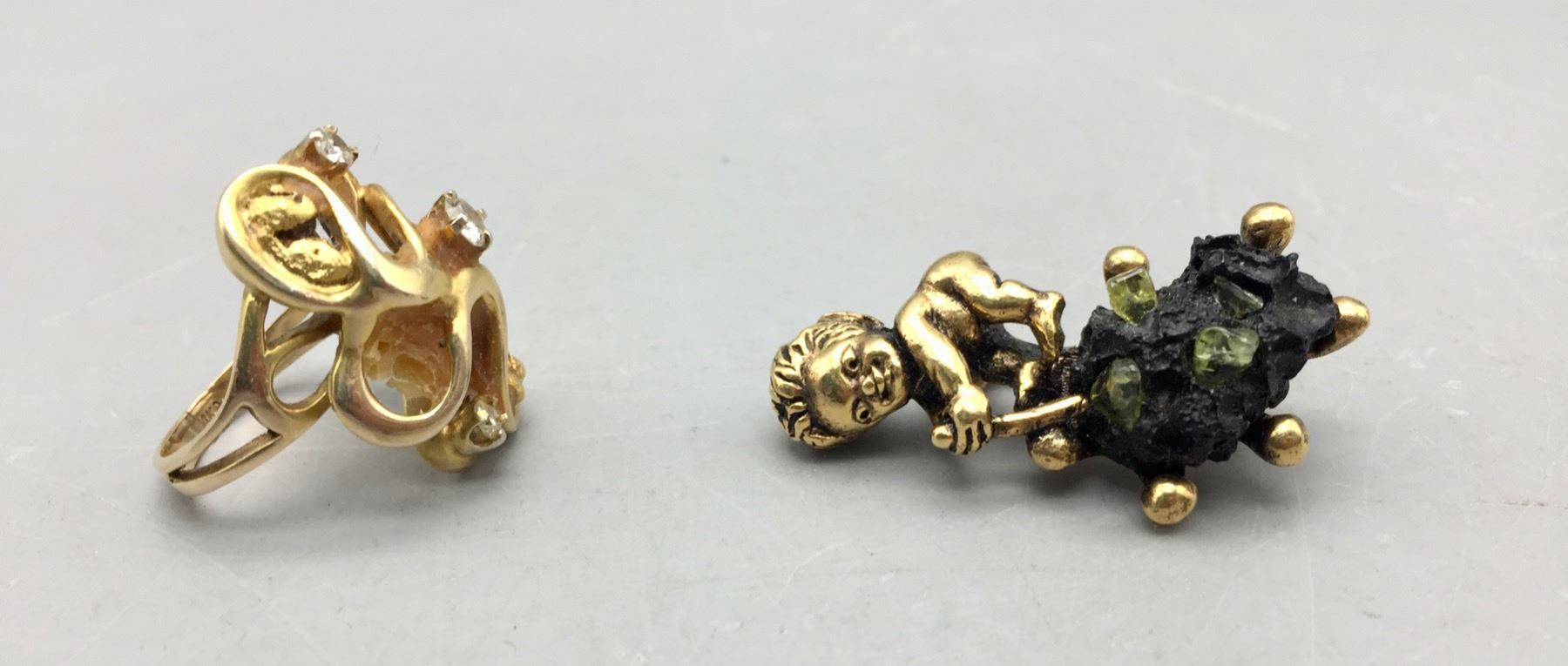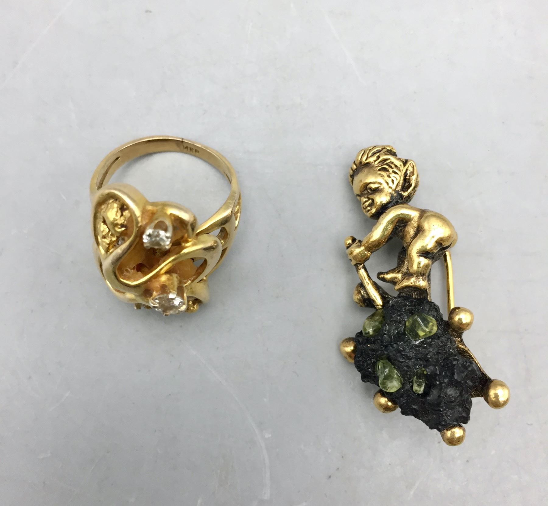 Description: Offered for sale here is a gold ring and a pin. The gold ring has unique work with what appears to be 2 little gold nuggets and 3 small diamonds (diamonds were not tested). The bottom of the shank inside is marked, 14KP. The pin also has a unique design with a little person set upon what appears to be a cinder with several small peridot stones. The little pin is not marked for metal content and we believe it to be plated at best or probably just gold colored. This item is from the estate of an old Doctor who worked in the outback of Alaska and often traded with the Natives. Maker: Various Approx. Age: Vintage. Size: Ring is a size 4-3/4. Combined weight is 20.4 grams. Condition: Good for their ages, normal wear expected. Please look closely at the pictures - they are an important part of our description. Shipping: There will be a $5 handling / packaging fee for shipping this lot. The actual cost of postage will be added on top of that.