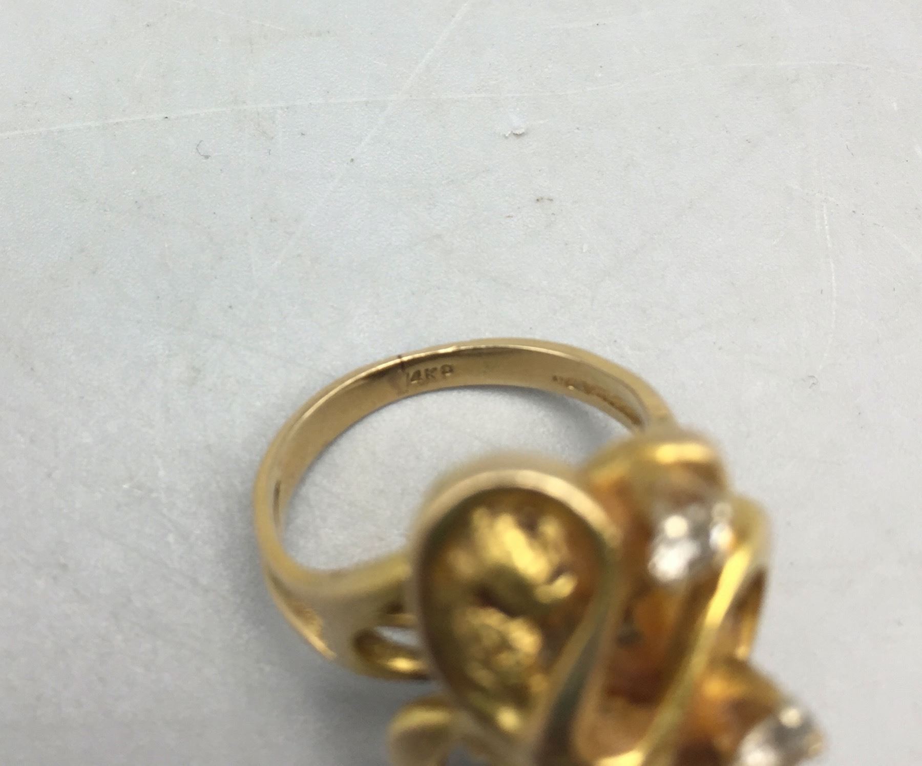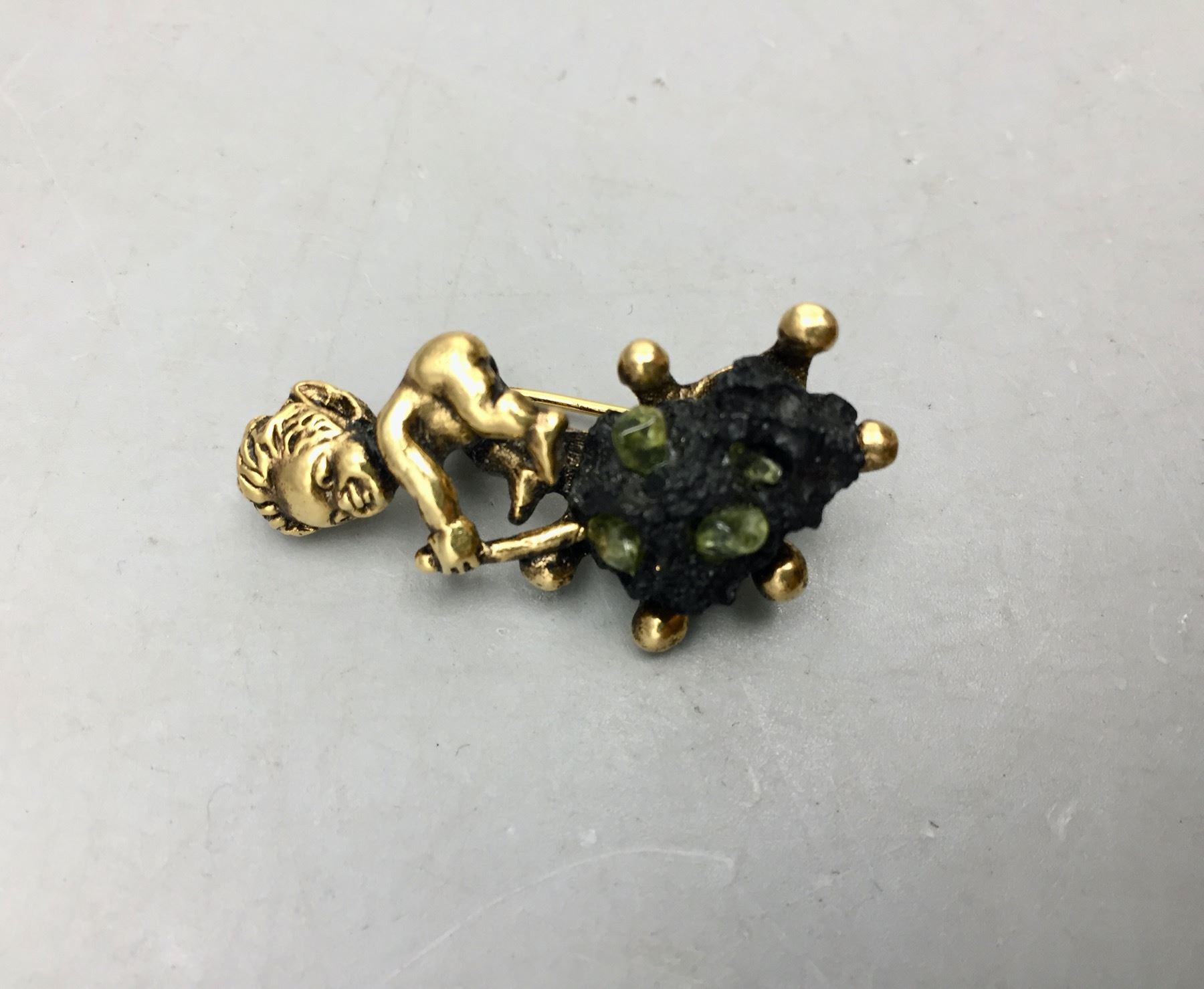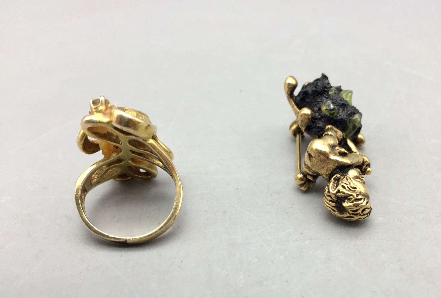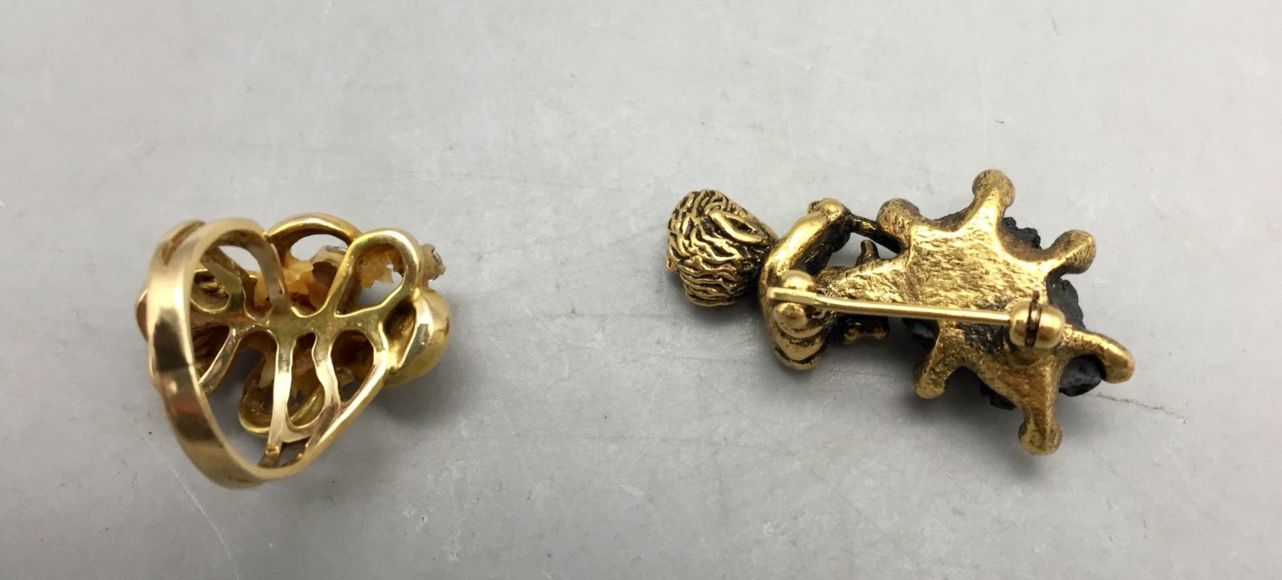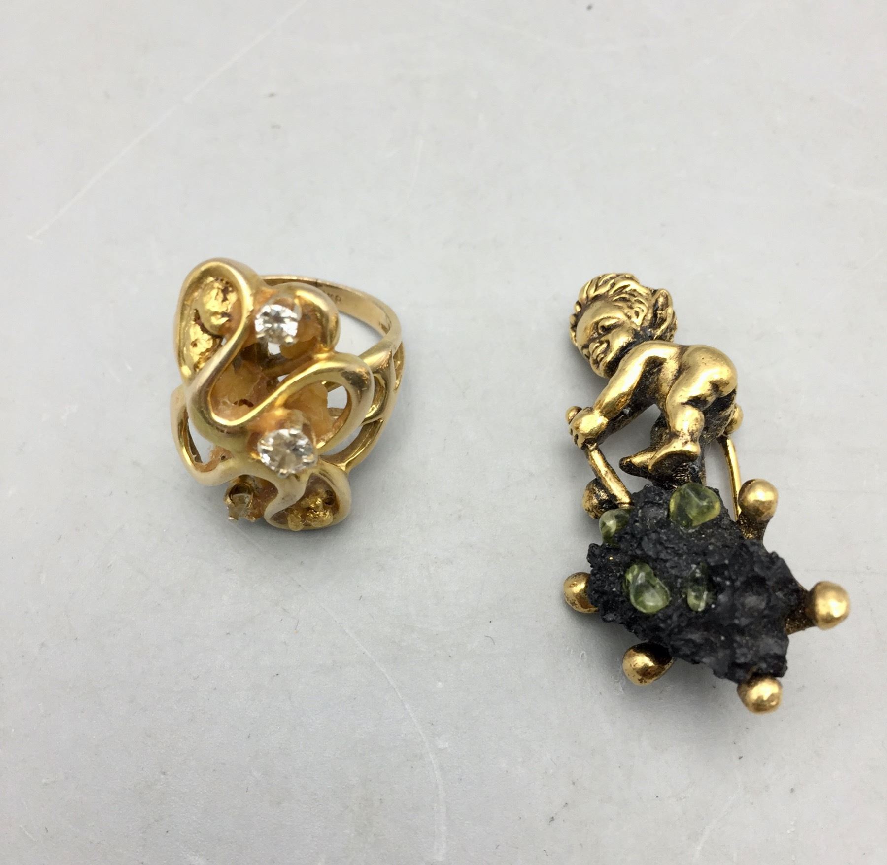 Description: Offered for sale here is a gold ring and a pin. The gold ring has unique work with what appears to be 2 little gold nuggets and 3 small diamonds (diamonds were not tested). The bottom of the shank inside is marked, 14KP. The pin also has a unique design with a little person set upon what appears to be a cinder with several small peridot stones. The little pin is not marked for metal content and we believe it to be plated at best or probably just gold colored. This item is from the estate of an old Doctor who worked in the outback of Alaska and often traded with the Natives. Maker: Various Approx. Age: Vintage. Size: Ring is a size 4-3/4. Combined weight is 20.4 grams. Condition: Good for their ages, normal wear expected. Please look closely at the pictures - they are an important part of our description. Shipping: There will be a $5 handling / packaging fee for shipping this lot. The actual cost of postage will be added on top of that.