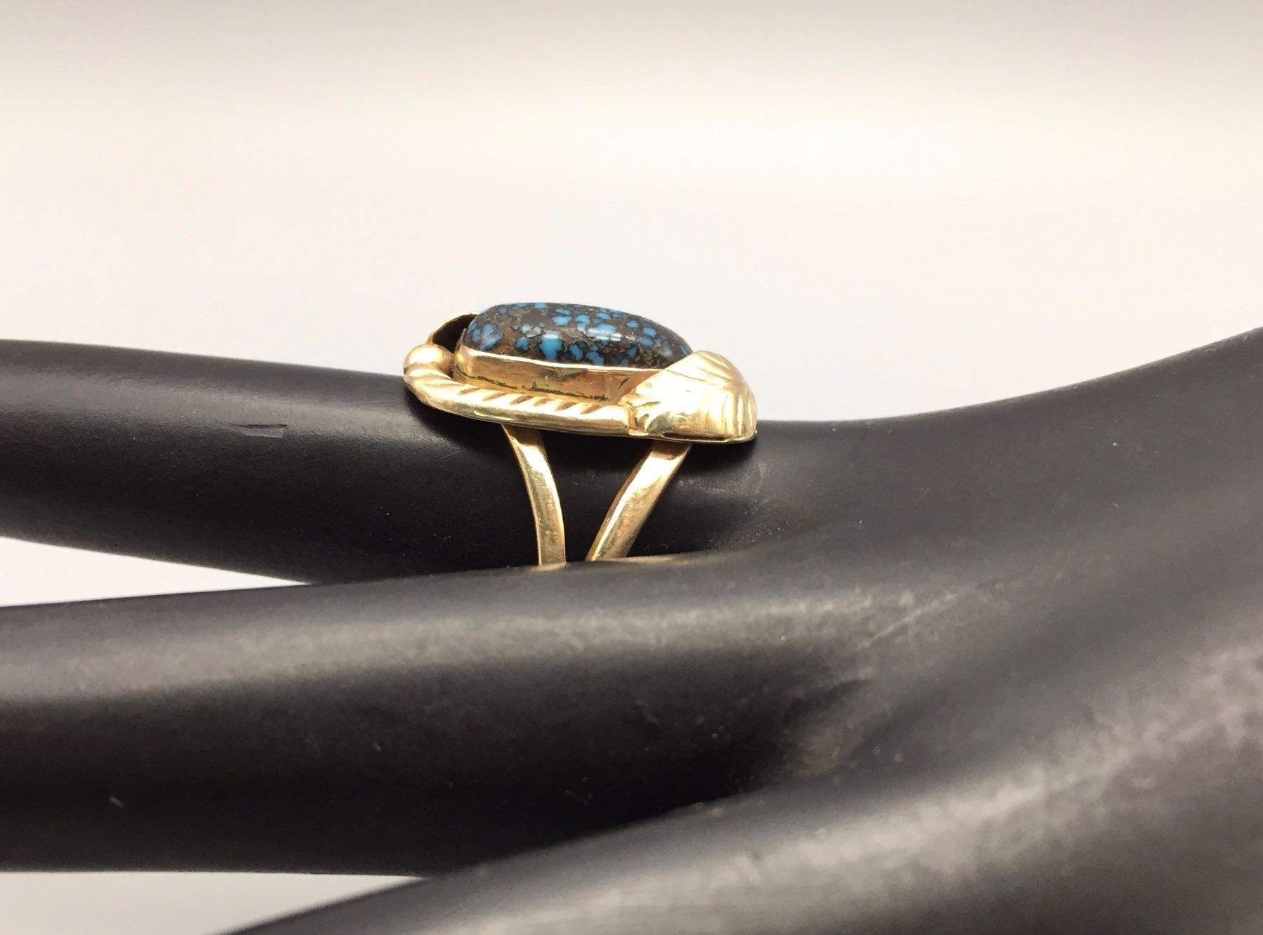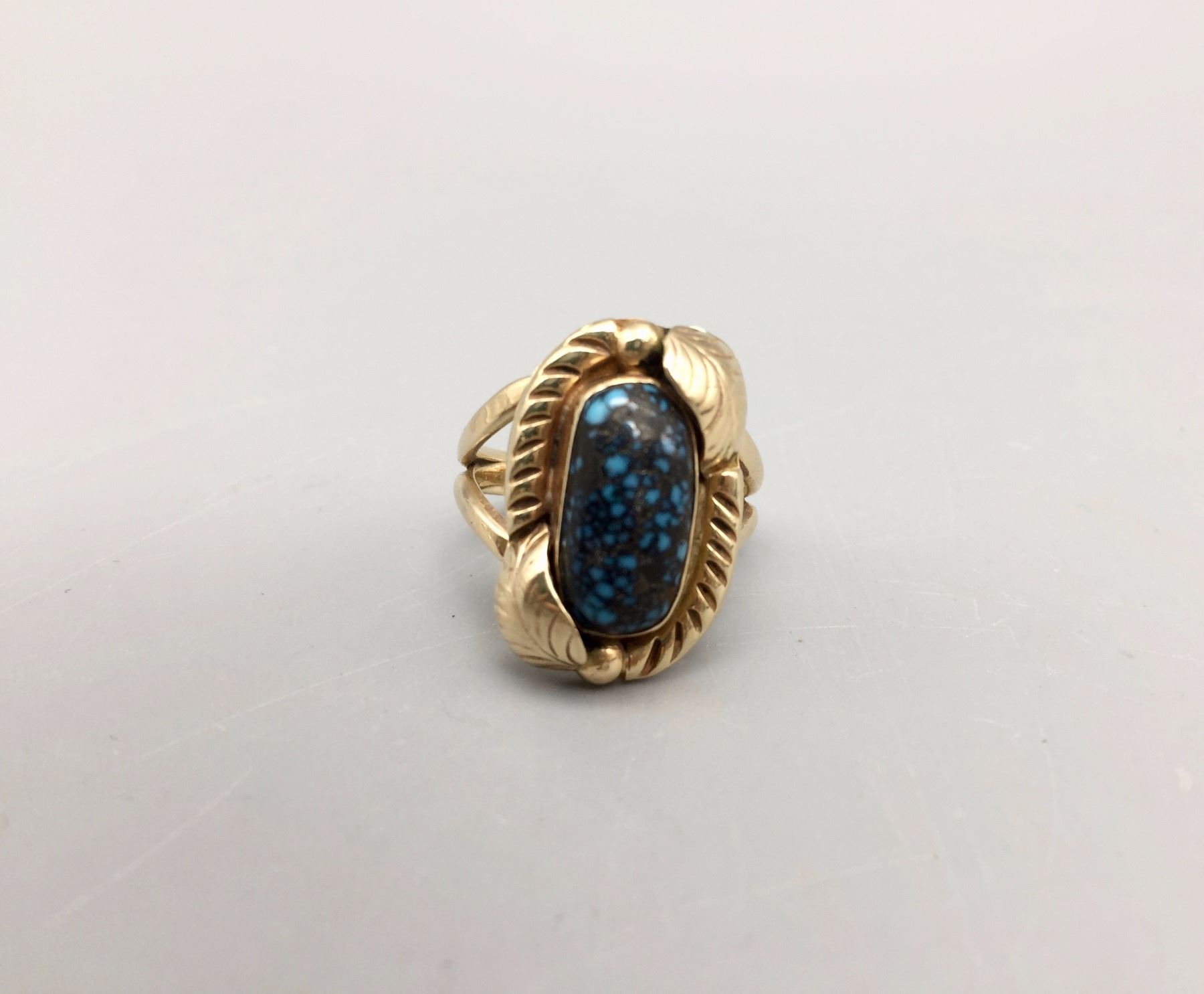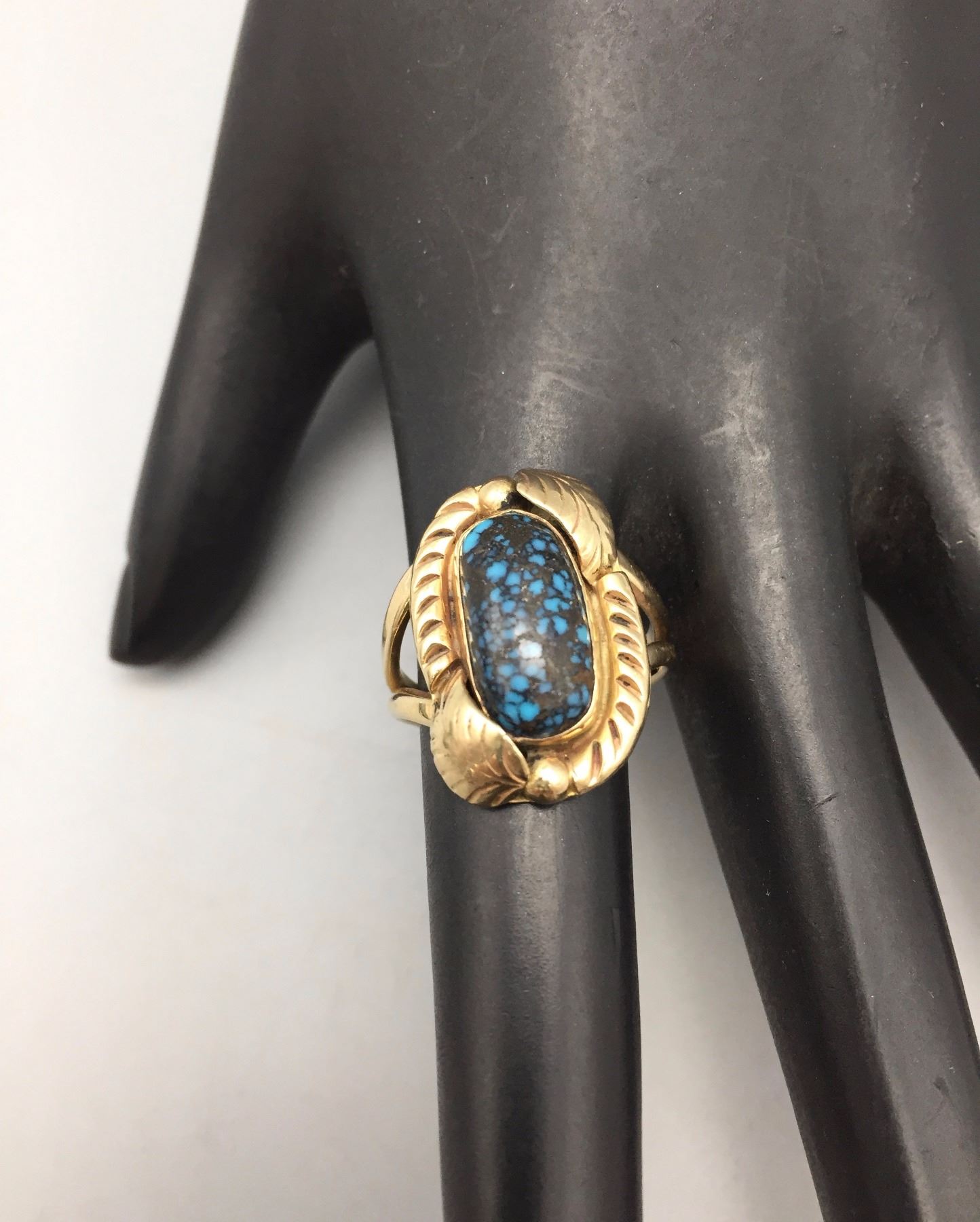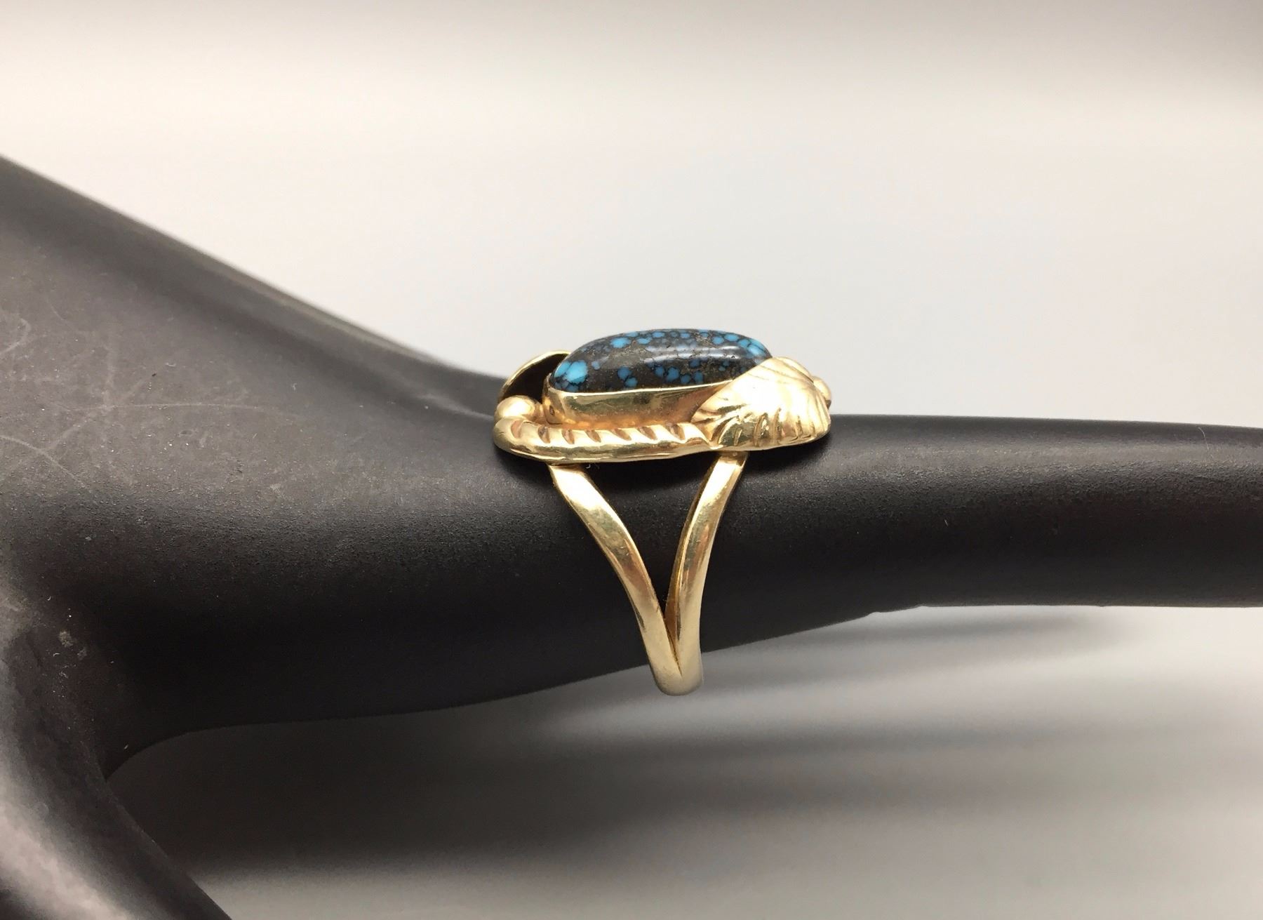 Description: 14k gold ring featuring a high grade, spiderweb turquoise stone. Maker: Hallmarked, DT & 14k. Approx. Age: Vintage. Size: Ring is size 6 1/2, is 3/4” at its widest point and weighs 6.5 g. Condition: Good for its age, normal wear expected. Please look closely at the pictures - they are an important part of our description. Shipping: There will be a $5 handling / packaging fee for shipping this lot. The actual cost of postage will be added on top of that.