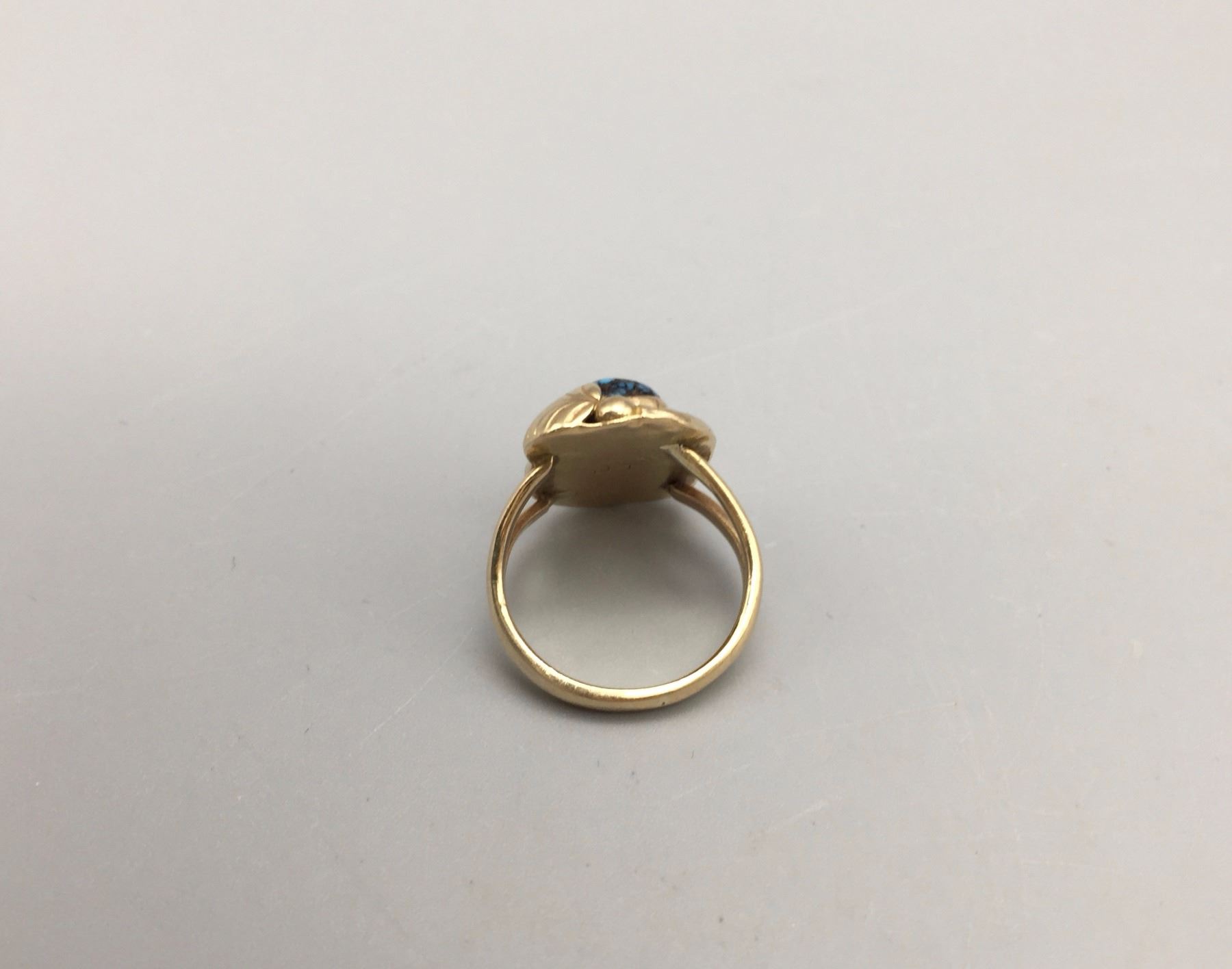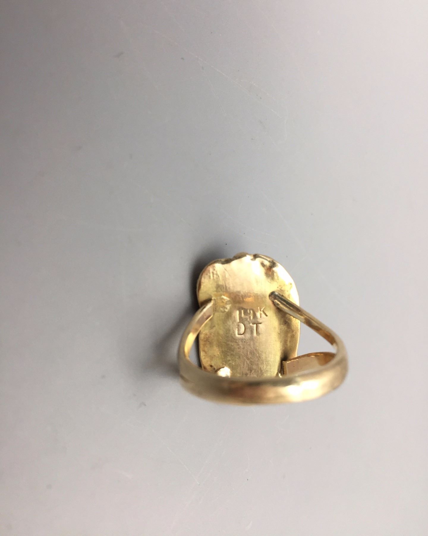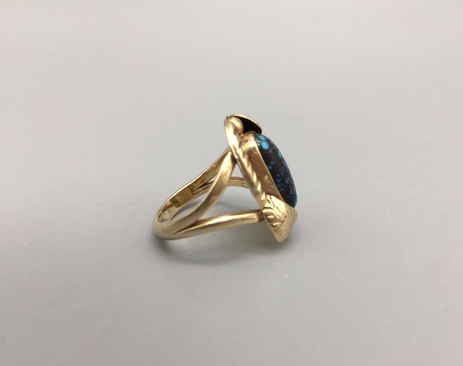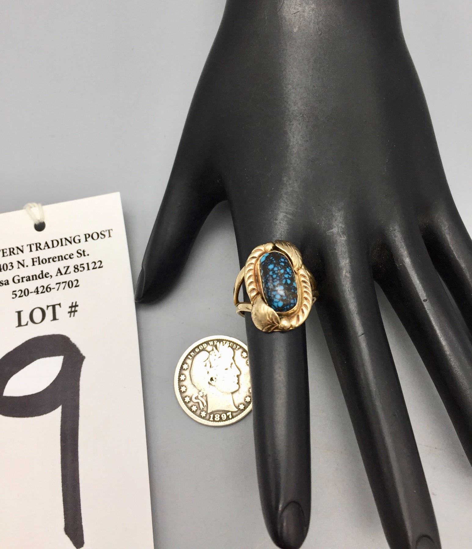 Description: 14k gold ring featuring a high grade, spiderweb turquoise stone. Maker: Hallmarked, DT & 14k. Approx. Age: Vintage. Size: Ring is size 6 1/2, is 3/4” at its widest point and weighs 6.5 g. Condition: Good for its age, normal wear expected. Please look closely at the pictures - they are an important part of our description. Shipping: There will be a $5 handling / packaging fee for shipping this lot. The actual cost of postage will be added on top of that.