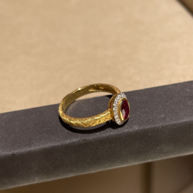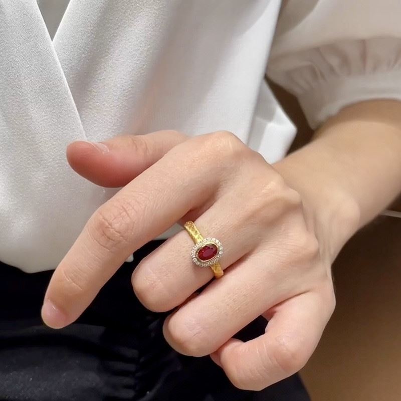 This ring features an oval ruby set in a gold band, surrounded by a delicate halo of diamonds. Its simple yet elegant design radiates both grace and passion.Ring size: 6, circumference: 52 mm, diameter: 16.6 mm, total weight: 3.34g.Note: GUILD certificate, comes with a jewelry, gemstone, and precious metal authentication certificate.