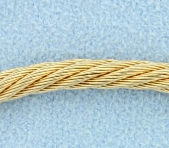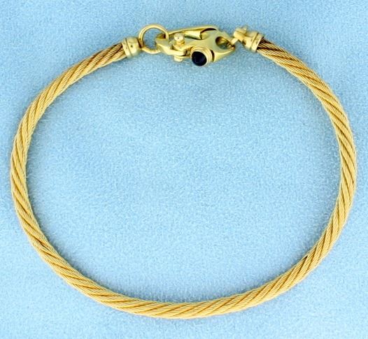 The bracelet is 14K yellow gold and is 8 inches long and 3mm wide. With a unique clasp that contains a cabochon natural sapphire. 13.3g