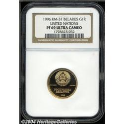 <B>Gold Rouble 1996, </B></I>KM31, Proof 69 Ultra Cameo NGC. United Nations 50th Anniversary. <BR><BR><B>Important notice:</B> Heritage usually auctions material at the rate of 200-250 lots per hour. On some occasions eBay Live bid software or the Internet may not be able to keep up with the pace of the auction. We recommend placing a realistic absentee bid now as insurance to avoid disappointment. Occasionally the auctioneer may eliminate or reject an eBay Live bid, and the auctioneer may also reopen a lot after the close of the eBay live bidding (usually because we missed an audience bid), and may reject your bid even if it shows you as the winning bidder. By bidding via eBay Live, you agree that Heritage may award the lot to another bidder at its sole discretion under the circumstances described above or any other reasonable circumstances. Since eBay bids are not shown to us until we open the lot on the floor, we treat those bids just like floor bids. In most cases the floor responds before the eBay bid is presented to us, due to Internet lag time, so for consistency we have made it a policy that floor bids are always considered first over tie eBay live bids. Also please note that all Heritage lots purchased through eBay Live carry a 20% Buyer's Premium. Please make sure you read the Terms and Conditions before you bid.