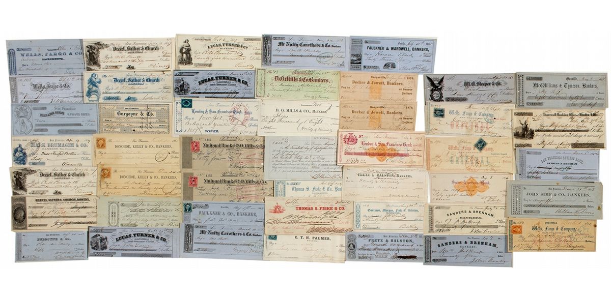 c1850 Between 1849 and 1852 five express companies were put in operation in San Francisco. These Were Adams & Co., Page Bacon & Co., Palmer Cook & Co., Todd & Co., and Wells Fargo & Co. In Addition to these express companies were scores of bankers and money changers. Most of those who took to banking in those early days in San Francisco were entirely new at the business, but the fact did not cut any figure. It seems that the chief essential required from one willing to take up a banking business at that time was to be the owner of a safe in a well-protected building. Prominent merchants had such safes and it was an easy matter to add to banking to that of merchandising under the same roof. This collection contains checks of this period. All are rare and many are unique. The Remainder of the Gold Rush Bankers Check Collection contains 41 checks. Brumgin & Co., Burgoyne & Co., Drexel, Sather & Church, Donohoe Kelly & Co., Decker & Jewett, Thomas Fiske, Faulkner & Wardell, Fretz & Ralston, Donohoe & Ralston, Garrison, Morgan, Fretz & Ralston, London & San Francisco, D.O. Mills, Lucas & Turner, McNulty & Carothers, McWilliams & Tymeson, CTH Palmer, Rhodes & Co., Swiss American, Sleeper & Co., Sanders & Brenham, John Sime & Co., G. Frank Smith, Wells Fargo & Co., and finally James King of William. Approx. 40 Checks. Please Call for Personal Descriptions. - HKA#66316