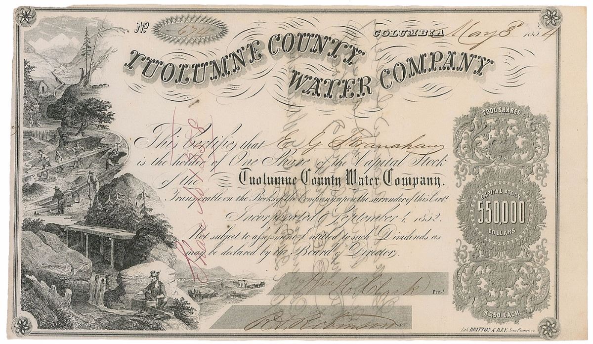 Ornately engraved partly-printed DS, signed “Wm. H. Clark,” one page, 10 x 5.75, May 3, 1854. Stock certificate for the Tuolumne County Water Company with a wonderful vignette depicting miners working a sluice and cradle, certifying that “E. G. Stranahan is the holder of One Share of Capital Stock.” Signed at the conclusion by William H. Clark as president of the company and countersigned by R. H. Robinson as its secretary. In very good condition, with show-through from a tape repair to expected cancellation cuts to the body, as well as show-through from docketing to the reverse concerning the transfer of the stock.