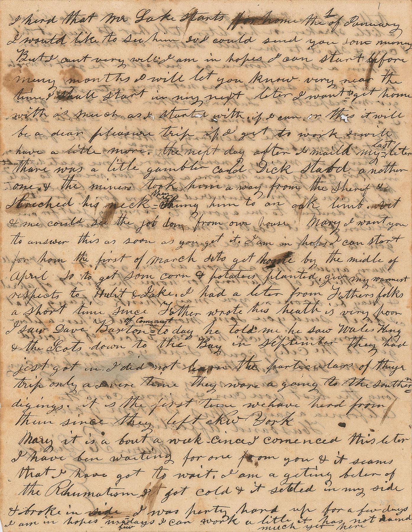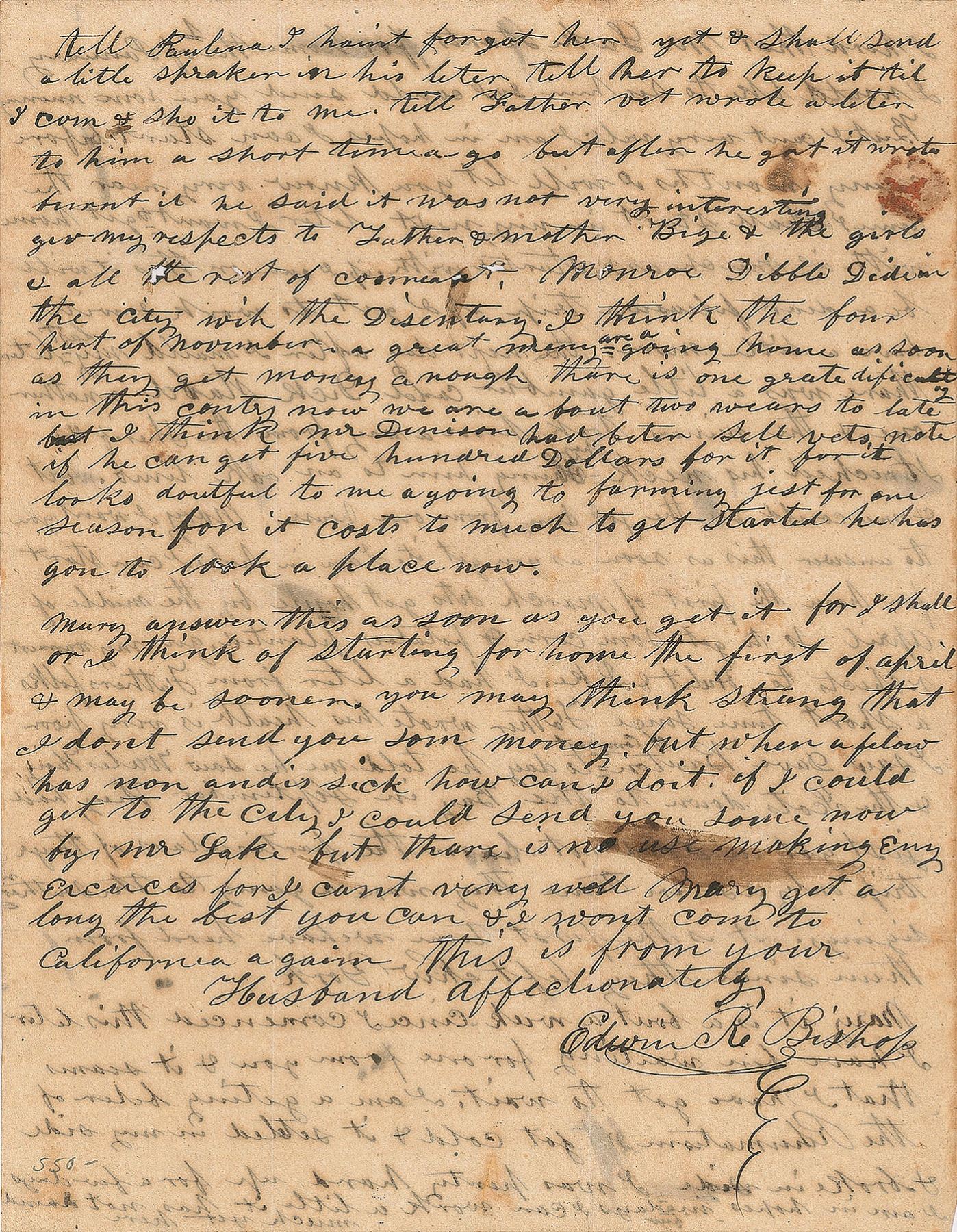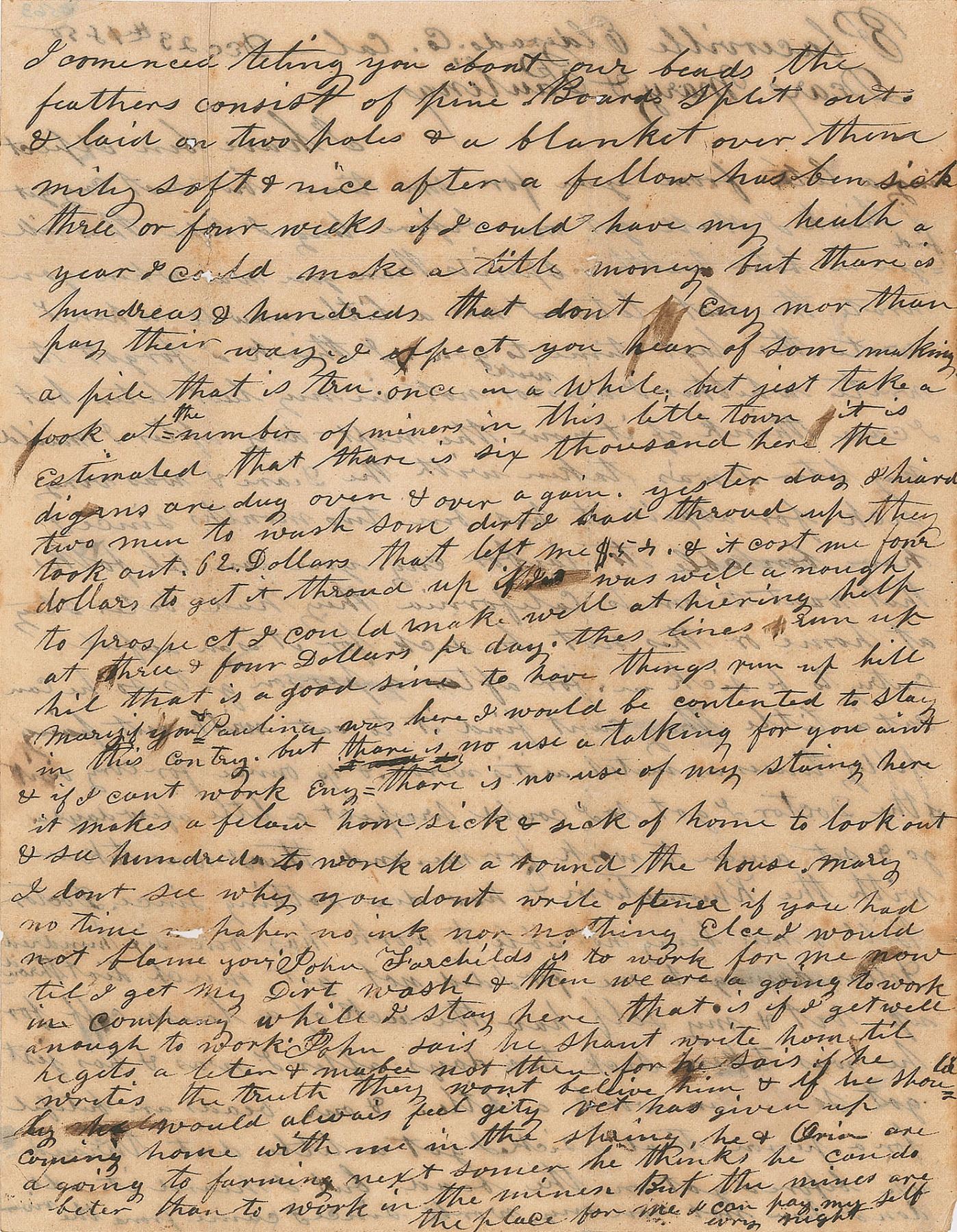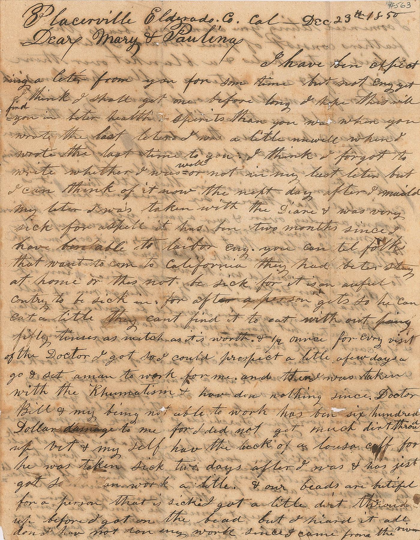 ALS signed “Edwin R. Bishop,” four pages on two adjoining sheets, 7.5 x 9.5, December 23, 1850. Written from Placerville in El Dorado County, California, Bishop writes a lengthy letter to his wife and daughter, Mary and Paulina, offering a unique glimpse into the mundane and often brutal realities of life in California during the Gold Rush. The letter, in part (spelling and grammar retained): "I…was very sick for aspell it has been two months since I have been able to labor any. You can tell folks that want to come to California they had beter stay at home or they not be sick for after a person gets so he can eat a little they can’t find it to eat without paying fifty times as mutch as it is worth & 1/2 ounce for every visit of the doctor I got so I could prospect a little a few days ago & set a man to work for me and then I was taken with the Rhumatism & now done nothing since. Doctor Bill & my being not able to work has been six hundred Dollars damage to me for I did not get much dirt throwed up…if I could have my health a year I could make a little money but there is hundreds and hundreds that dont any mor than pay their way. I expect you hear of some making a pile that is tru once in a while; but jist take a look at the number of miners in this little town. it is estimated that there is six thousand here. the digins are dug over & over again." Bishop's account of the lynching: "The day after I maild my last leter there was a litle gambler cald Dick Staud another one of the miners took him a way from the Sherif & stretched his neck, they hung him to an oak limb & me could see the job done from our house." In fine condition, with light staining, and writing showing through from opposing sides.