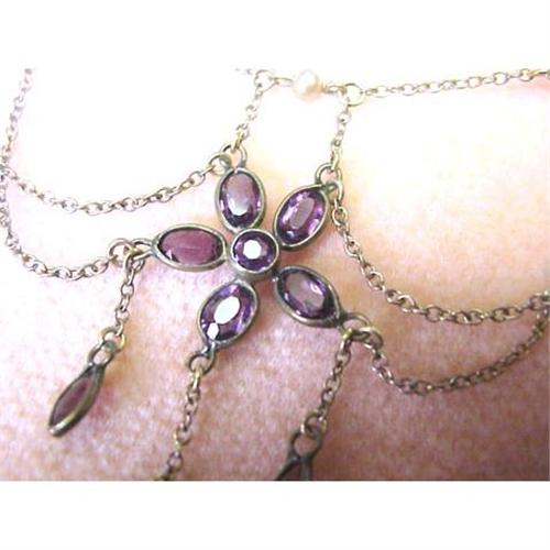 This is a fine 10 ct. yellow gold necklace, very dainty,(Lace like) and quality made, a perfect specimen of Victorian Jewelry,which can not be produced with the same finesse nowdays. This exquisite necklace is made of 10ct gold adorned with 5 tiny round seed pearls, 4 dainty chains draping around the gorgeous large flower, made from 5 faceted amethyst stones,there are 3 amethyst hanging on the chains as adrops, please see our pictures, Each amethyst stone measures close to 1/4" ,- Love this heirloom piece with great style and qulity.Marked Birks 10ct. on the clasp - Please include 6.00 for shipping plus insurance.- Thank You for looking.