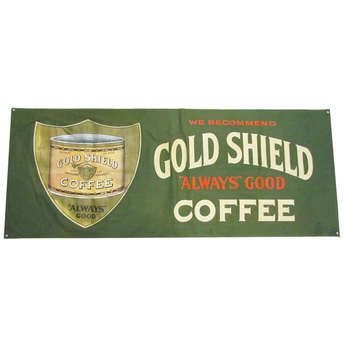 Gold Shield Coffee Cloth Banner. Excellent condition. 6 foot X 28 inches.