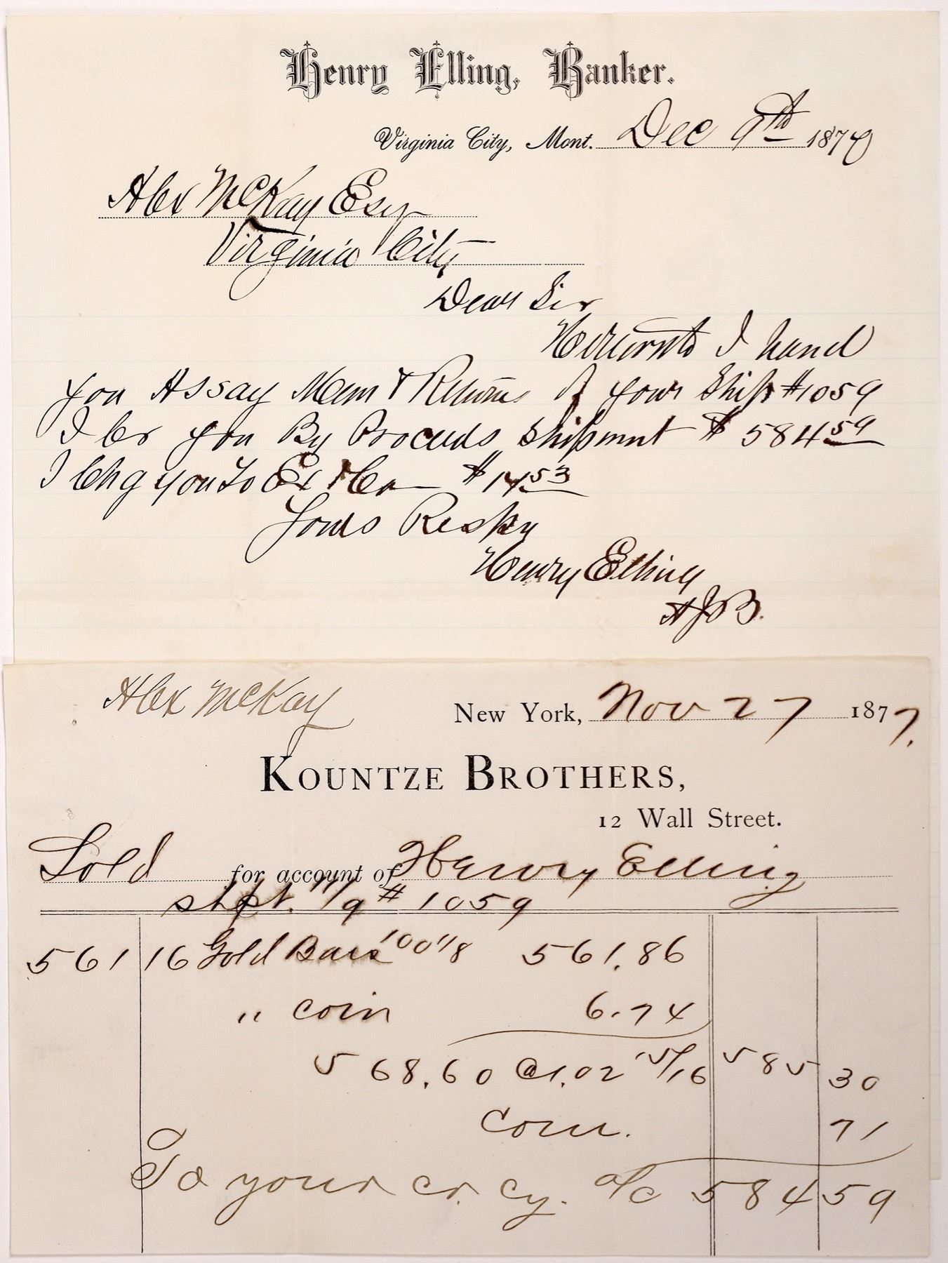1870 assay related letter signed by Henry Elling and 1877 Kountze Bros gold receipt for gold bars and coin. State:Montana City: Date: Provenance: Stuart Mackenzie Montana Ephemera Collection