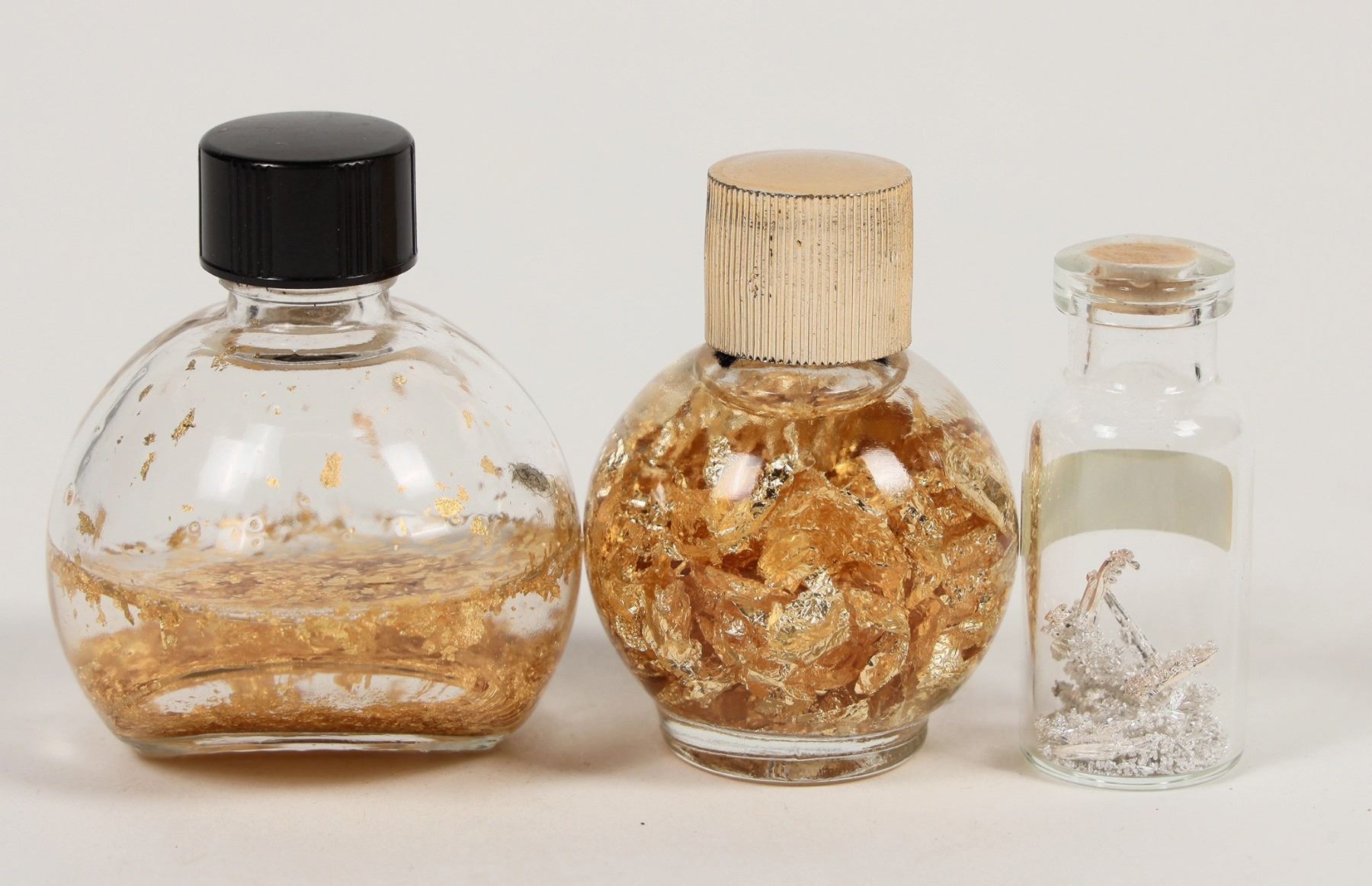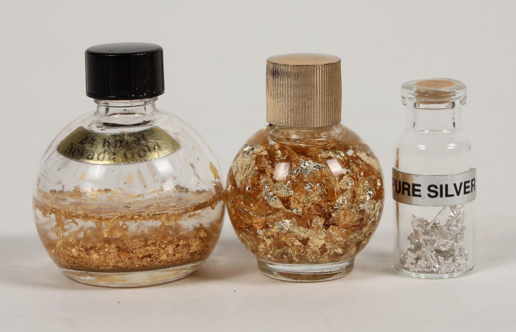 Four little vials: three 24 karat gold, ( 10 grams; 26 grams; 36 grams); one pure silver (8 grams).