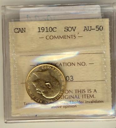 Gold Sovereign 1910c ICCS AU-50, some lustre.