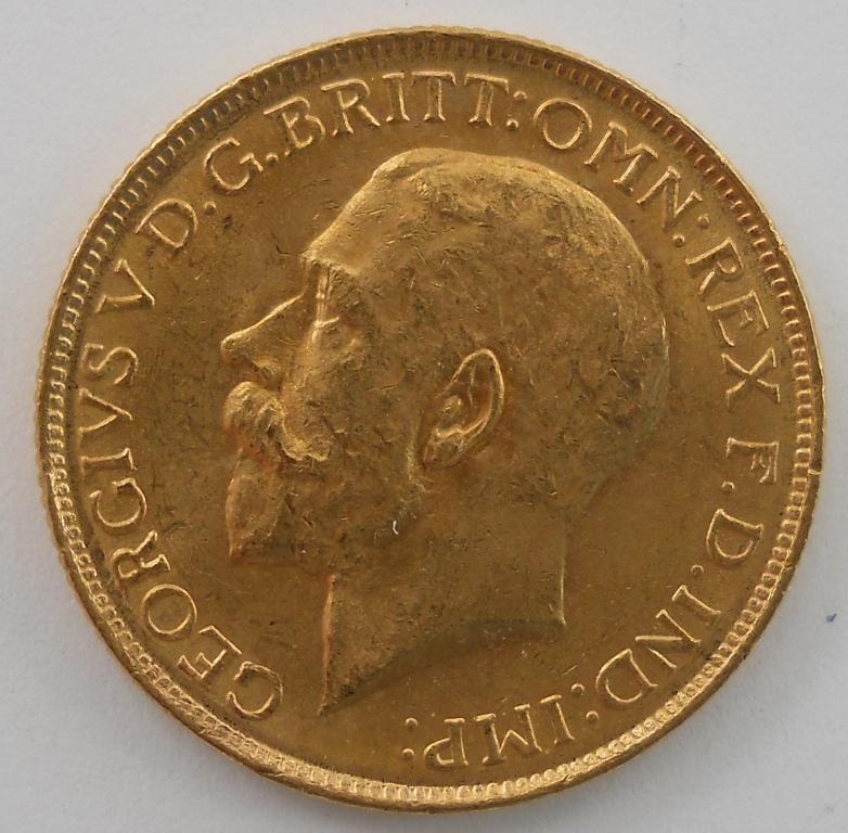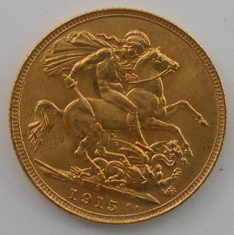 This 1915 gold Sovereign coin is 22-karat fine gold and contains .2355 ounces of gold. The obverse has a George V head facing left and the reverse has St. George slaying the dragon.