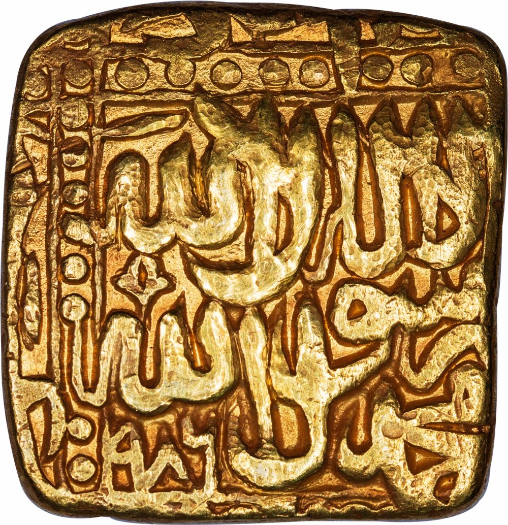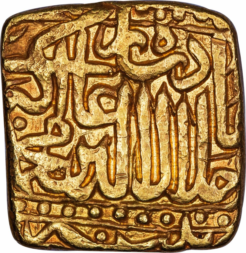 Akbar,Patna Mint, Gold Square Mohur, Kalima Type,AH 986, Obv: kalima shahada around four khalifas name, Rev: akbar badshah ghazi, 10.5g, 19.42 x 18.48mm,(Liddle# G22 KM# 111.1), about very fine, VeryRare.