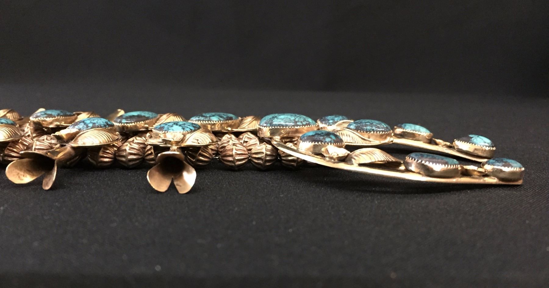 Description: Turquoise and 14k gold squash blossom with matching earrings. Nice spiderweb turquoise. Maker: George Henry, Navajo. Approx. Age: Vintage. Size: 24” around the neck and naja pendant measures 3” l x 2 5/8” w. Weight with earrings is 151.3 g. Condition: Good for its age, normal wear expected. Please look closely at the pictures - they are an important part of our description. Shipping: There will be a $5 handling / packaging fee for shipping this lot. The actual cost of postage will be added on top of that.