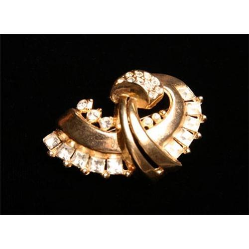 <tr><td>Title:Gold Swirl Brooch with Rhinestone Accents</td></tr>