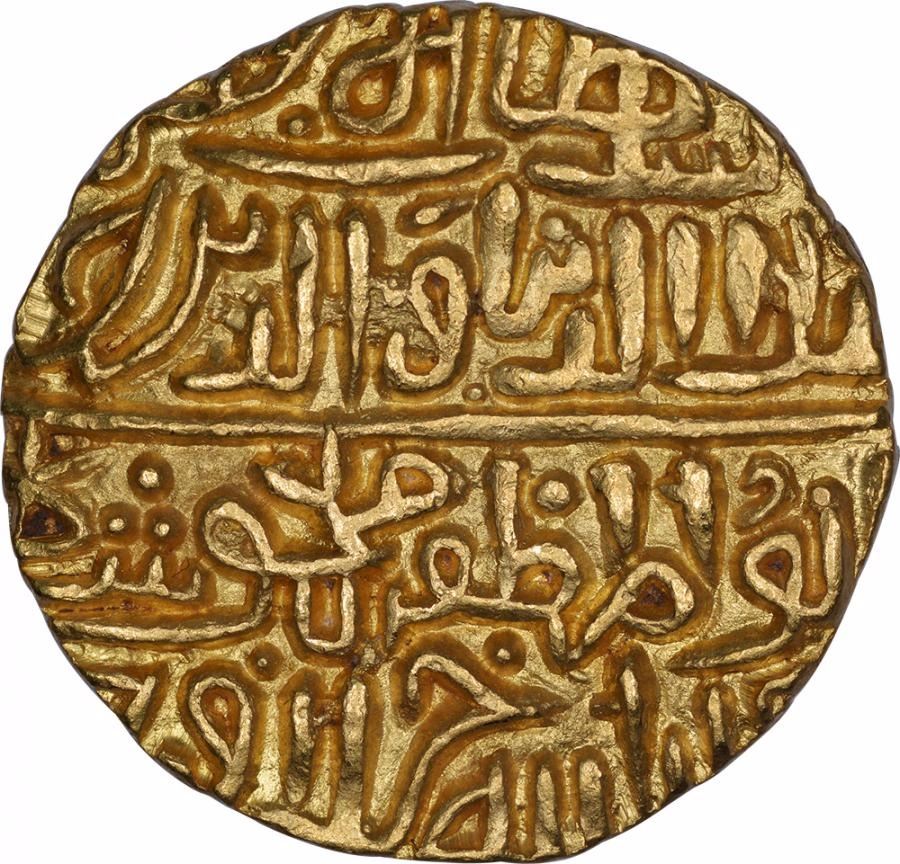 Malwa Sultanate,Ala-Ud-Din Mahmud Shah I, Hadrat Shadiabad Mint, Gold Tanka, Obv: al-sultan al-a zam ala al-dunya wa'l din khalji abu'l muzaffar mahmud shah khuldallahu khilafatahu,Rev: sikandar al-thani yamin al-khilafa nasir amir al-mu'minin, 11.08g, 24.16mm, (GG # M21), about extremely fine+,Scarce. Overall lovely and bold striking.