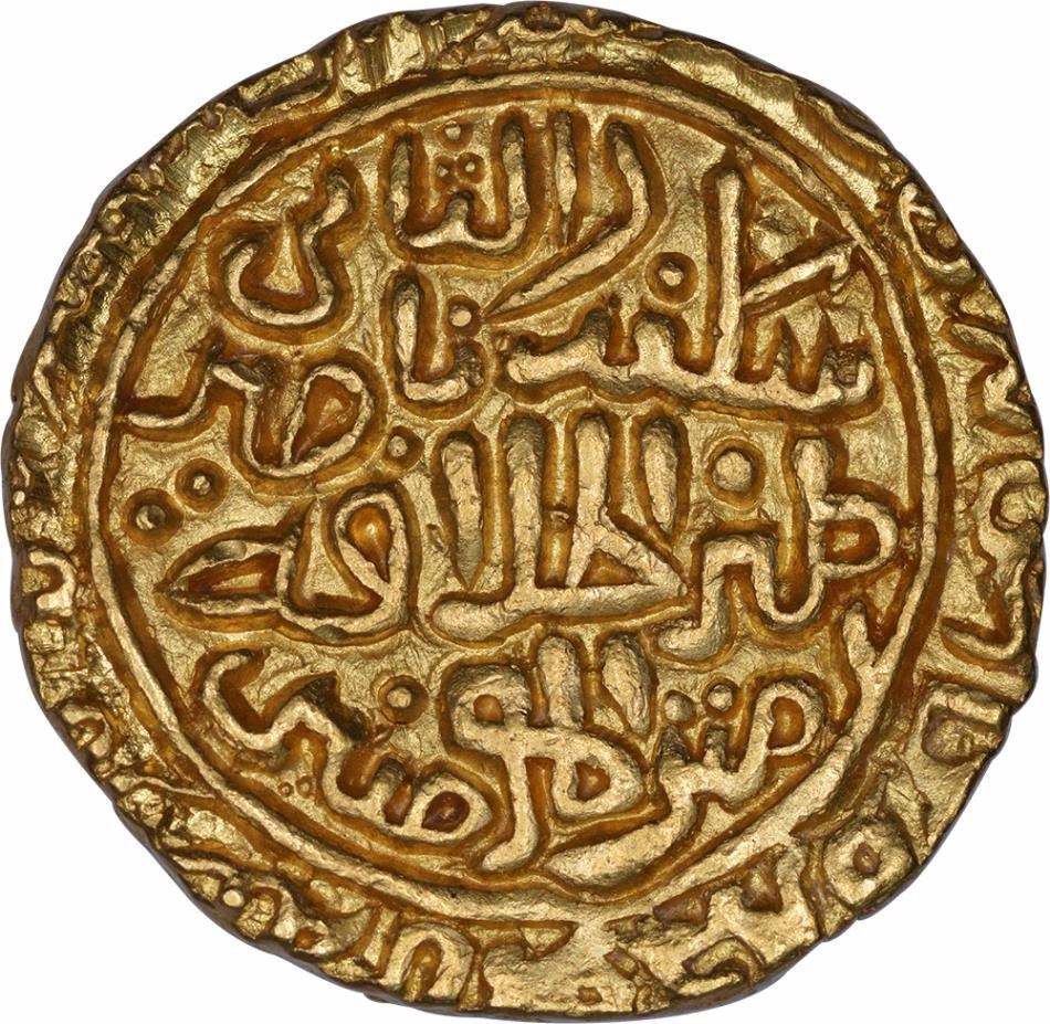 Malwa Sultanate,Ala-Ud-Din Mahmud Shah I, Hadrat Shadiabad Mint, Gold Tanka, Obv: al-sultan al-a zam ala al-dunya wa'l din khalji abu'l muzaffar mahmud shah khuldallahu khilafatahu,Rev: sikandar al-thani yamin al-khilafa nasir amir al-mu'minin, 11.08g, 24.16mm, (GG # M21), about extremely fine+,Scarce. Overall lovely and bold striking.
