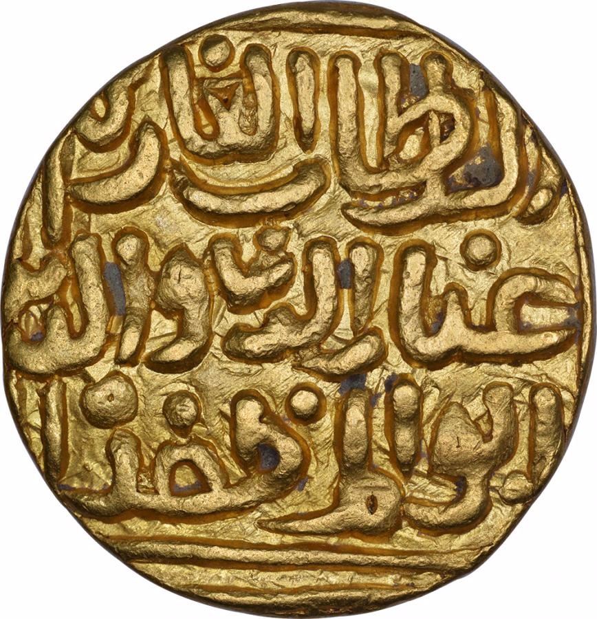 Delhi Sultanate,Ghiyath-Ud-Din Tughluq,Qila Deogir Mint, Gold Tanka, Obv: al-sultan al-ghazi ghiyath al-dunya wa'l din abu'l muzaffar, Rev: tughluq shah al-sultan nasir amir al-mu minin, 10.8g, 25.74mm, (GG # D302), about extremely fine with bold strikes, Scarce.