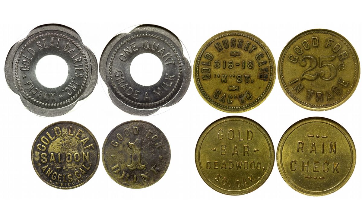 c1900 These are four GF merchant tokes. 1). Gold Nugget Cafe, Sacramento, 2). Gold Leaf Saloon, Angels, CA, 3). Gold Seal Dairy, Phoenix, AZ & 4). Gold Bar, Deadwood, SD - HKA#65730